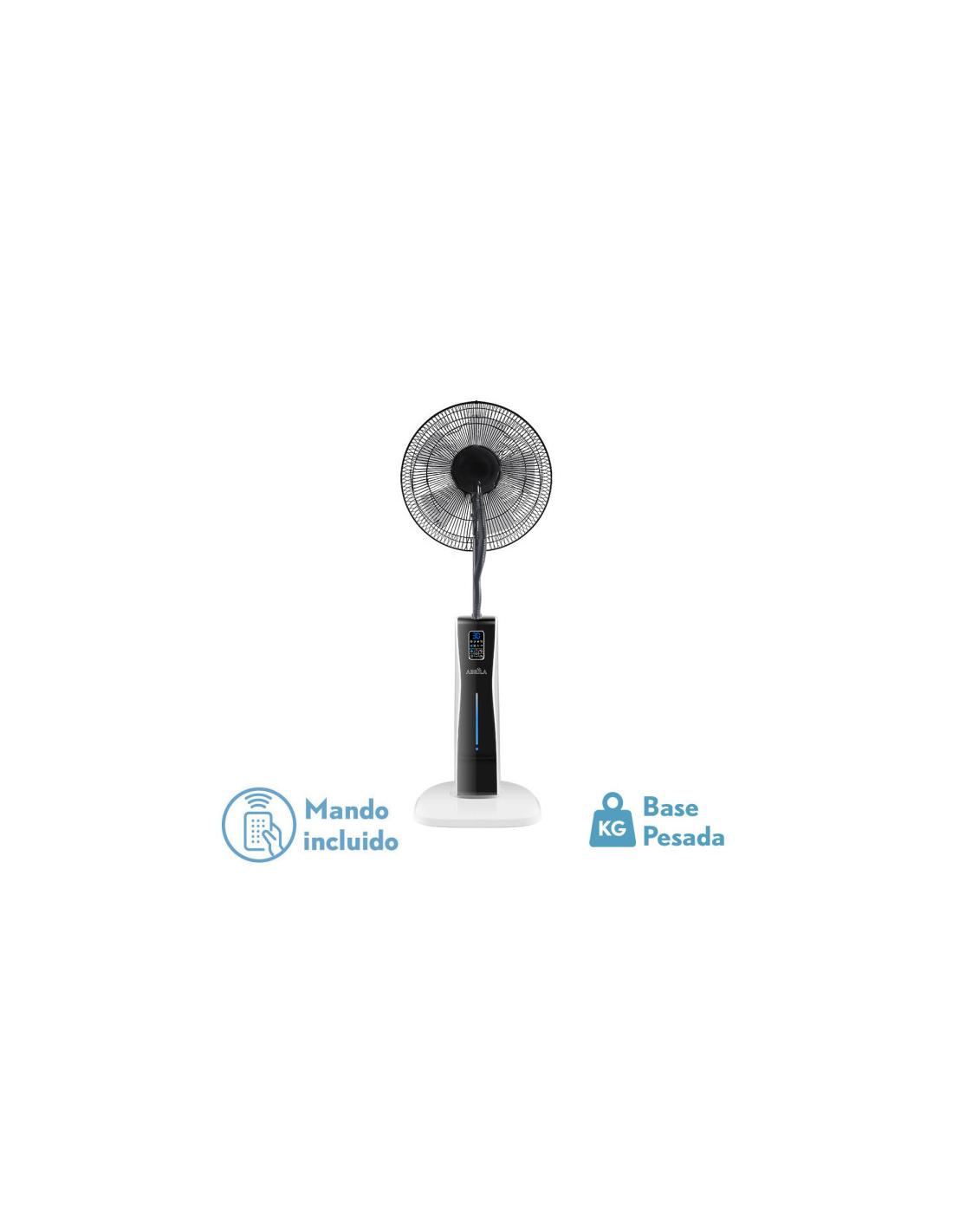 Ventilador de Pie de la serie CORVO con NEBULIZADOR Y TANQUE DE AGUA DE 2 LITROS, en color BLANCO/NEGRO con cinco aspas y tres velocidades. Gracias a su función nebulizadora, refresca y humifica rápidamente cualquier estancia, ideal para terrazas y patios, pulveriza micropartículas de agua con lo que aumenta la humedad y elimina el polvo. Realizado en metal y policarbonato. Motor AC. Tiene una potencia de 75 watios. Dos posiciones, fijo y rotatorio, también oscilante, pudiéndose redirigir el aire a la zona deseada y tres modos de aire NATURAL-SUEÑO-NORMAL. Presenta unas dimensiones de 125x43x40 centímetros. Manejo táctil con indicador LED, con mando a distancia INCLUIDO y TEMPORIZADOR de 1 a 12 horas, pudiendo seleccionar que el ventilador se apague solo automáticamente y consiguiendo un gran ahorro de energía. Viene con 4 ruedas invisibles para facilitar su traslado. El ventilador y el nebulizador pueden utilizarse por separados o juntos.