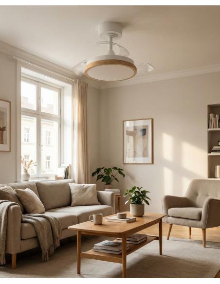 El ventilador de techo MALPICA en blanco/roble destaca por sus medidas variables de Ø 430/830 mm y una altura de 305 mm. Con un motor DC de 21 vatios, un flujo de aire de 5700 m³/h, así como una potencia LED de 20 vatios, 3000 lúmenes y luz blanca ajustable, combina una circulación eficiente del aire con una iluminación flexible y regulable.