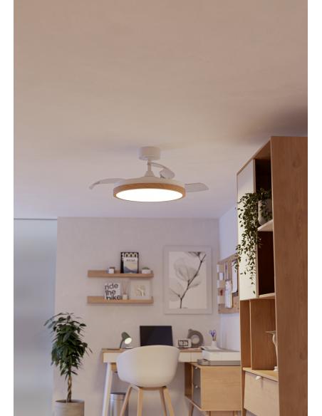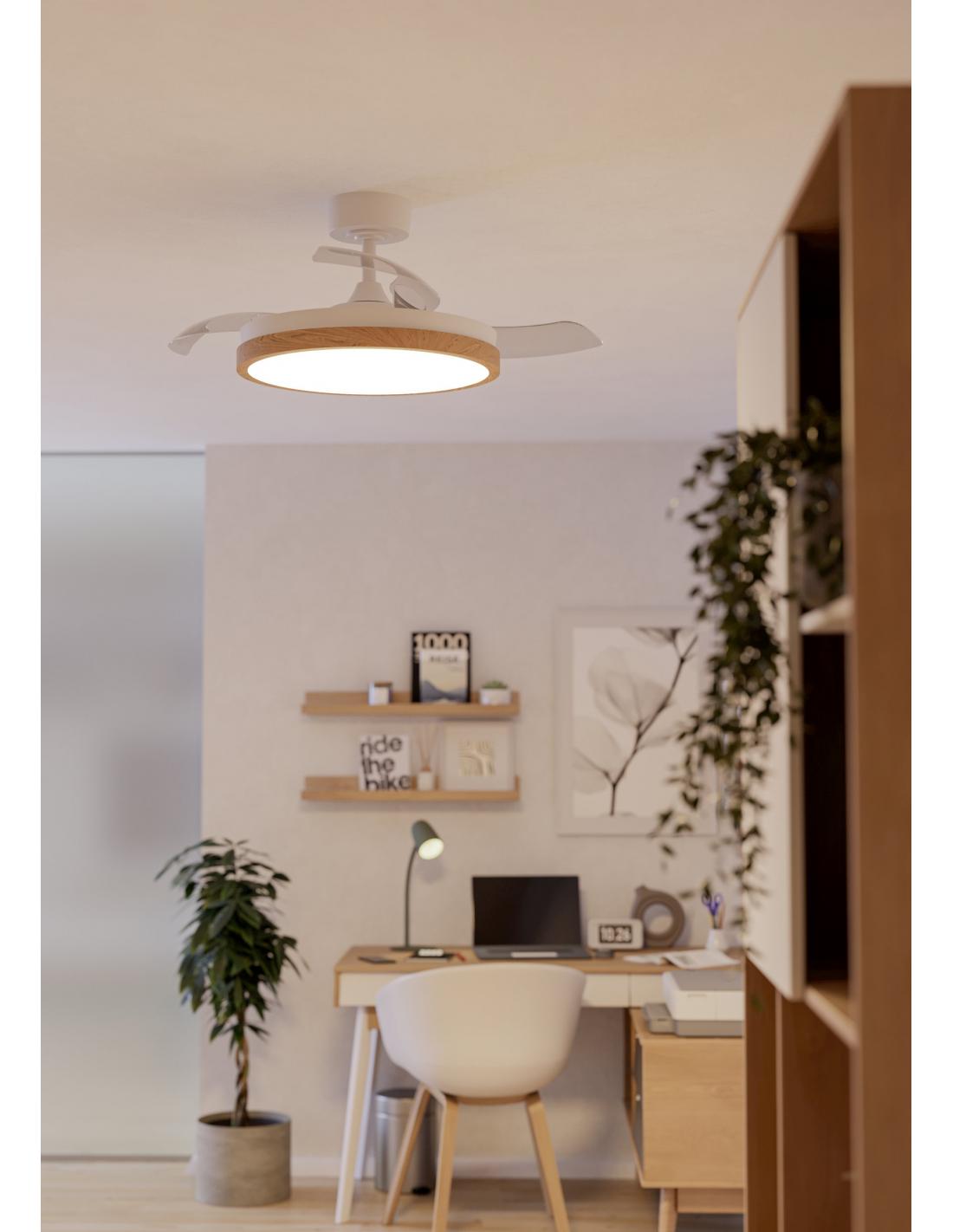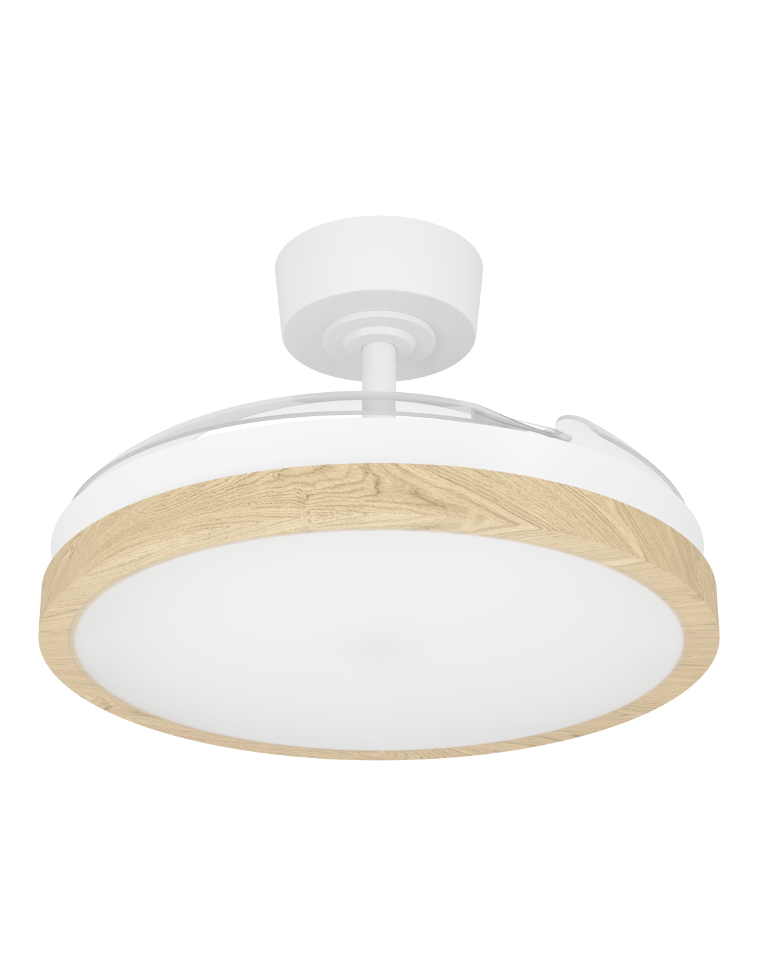El ventilador de techo MALPICA en blanco/roble destaca por sus medidas variables de Ø 515/980 mm y una altura de 310 mm. Con un motor DC de 27 vatios, un caudal de aire de 7300 m³/h, así como una potencia LED de 24 vatios, 3600 lúmenes y luz blanca regulable (Tunable White), combina una potente circulación de aire con una iluminación ajustable de forma flexible.