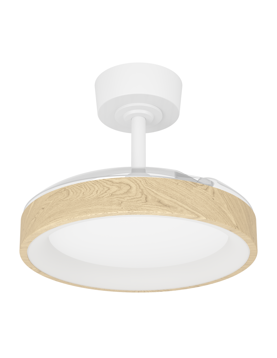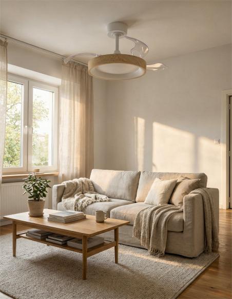 El ventilador de techo TORREYA en blanco/roble destaca por sus dimensiones variables de Ø 400/830 mm y una altura de 310 mm. Con un motor DC de 21 vatios, un caudal de aire de 5700 m³/h, así como una potencia LED de 20 vatios, 3000 lúmenes y luz blanca regulable, combina una circulación de aire eficiente con una iluminación ajustable de forma flexible.