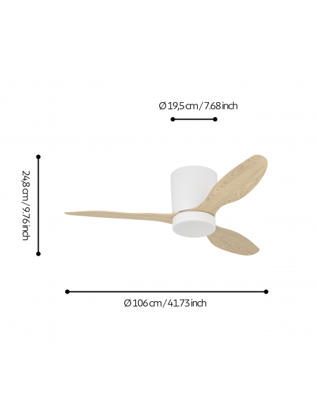 El ventilador de techo BARCARÈS en blanco con roble combina unas generosas dimensiones de Ø 1320 mm y una altura de 350 mm con tecnología LED moderna. Con un motor DC de 27 vatios, un flujo de aire de 10.800 m³/h, así como una potencia LED de 20 vatios, 3000 lúmenes y luz blanca regulable, proporciona una circulación de aire potente y una iluminación ajustable de forma individual.