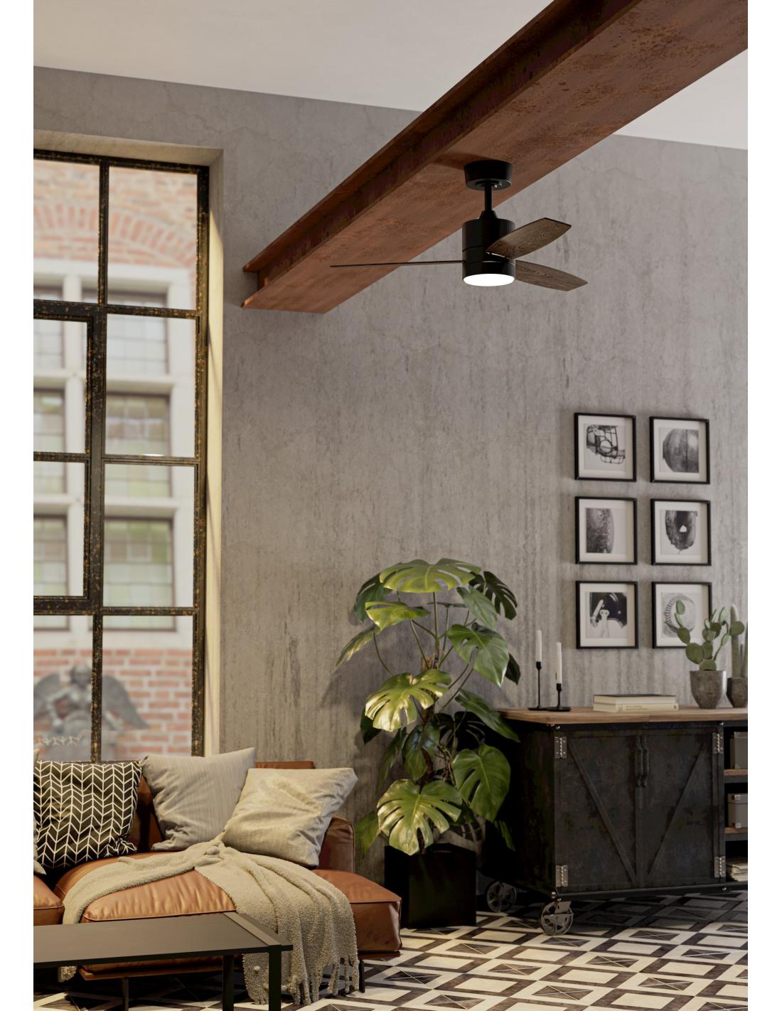 El ventilador de techo MANDAREE en negro/nogal destaca con un diámetro de 1060 mm y una altura de 380 mm. Con un motor DC de 25 vatios, un caudal de aire de 7500 m³/h, así como una potencia LED de 20 vatios, 3000 lúmenes y luz blanca ajustable, combina una potente circulación de aire con una iluminación flexible y regulable.