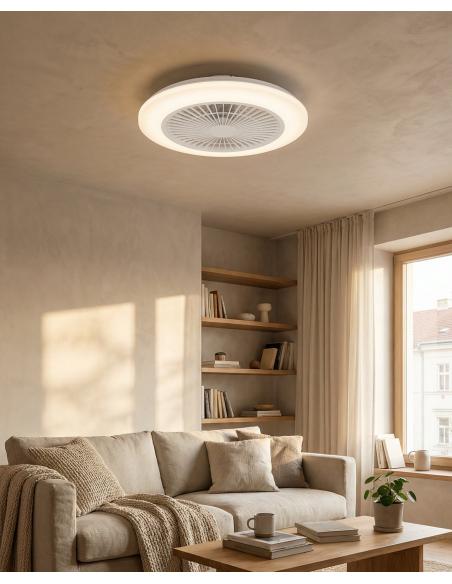 El ventilador de techo WINDLEY destaca por su diseño compacto y plano, ideal para espacios pequeños. Con un diámetro de 51 cm y una altura de solo 15,5 cm, se integra discretamente en diversos estilos de decoración. Su potente motor DC de 18 vatios genera un flujo de aire de hasta 2.500 m³/h, asegurando una circulación de aire agradable. La luz LED integrada de 36 vatios proporciona 5.400 lúmenes y, gracias a la función Tunable White, ofrece colores de luz ajustables individualmente, desde blanco cálido hasta blanco frío. Además, la función RGB permite acentos de luz de colores para crear ambientes especiales. Así, el WINDLEY es adecuado tanto para una iluminación funcional en el día a día como para escenarios lumínicos atmosféricos.
