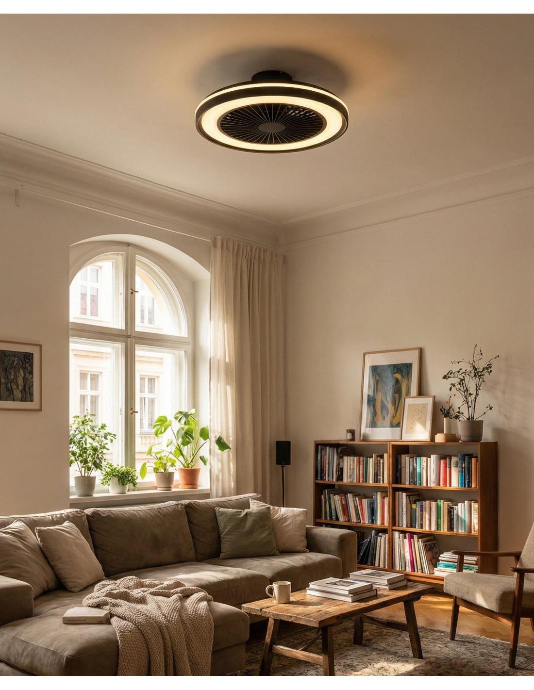 El ventilador de techo negro SINT ANDRÉ 35203 combina un diseño moderno con tecnología LED de alto rendimiento, con un diámetro de 510 mm y una altura de 155 mm. Cuenta con un motor DC de 18 vatios, un caudal de aire de 2500 m³/h, así como 36 vatios, 5400 lúmenes y luz Tunable White más RGB, proporcionando una circulación de aire efectiva y ambientes luminosos versátiles.