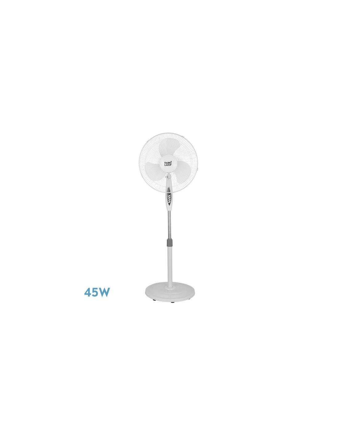 Ventilador de Pie de la serie BISE en color BLANCO con tres aspas y tres velocidades. Realizado en metal y policarbonato. Motor AC. Tiene una potencia de 45 watios. Dos posiciones, fijo y rotatorio, también oscilante, pudiéndose redirigir el aire a la zona deseada. Presenta unas dimensiones, con altura regulable, de 105<,130x43x40 centímetros. Mando a distancia INCLUIDO y TEMPORIZADOR de 0,5 a 7,5 horas.