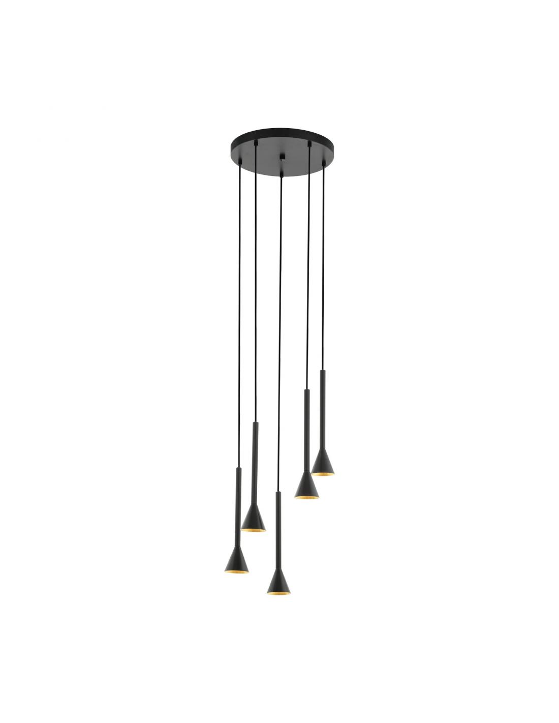 Reference EGLO 97606 is a led pendant lamp from the CORTADERAS Collection with the following technical characteristics 5X5W 220-240V,50/60Hz. It is characterized by the use of steel materials as the main part. Its black color stands out in the lamp. Includes features like 3-step Dimmable. Requires 5 GU10 socket bulbs (included). The manufacturer of this collection is EGLO, prestigious marca that stands out for the quality of its designs and for being a world leader in lighting.