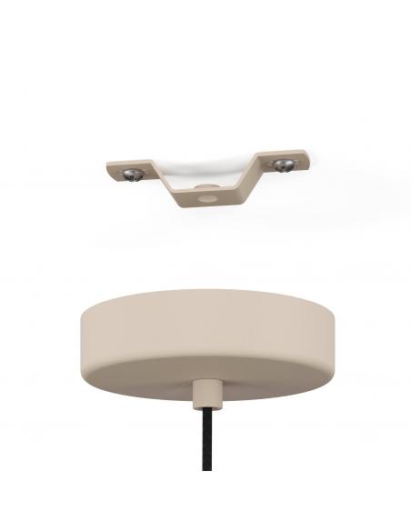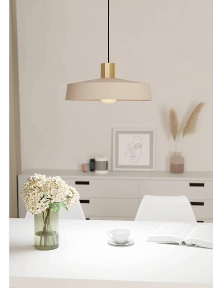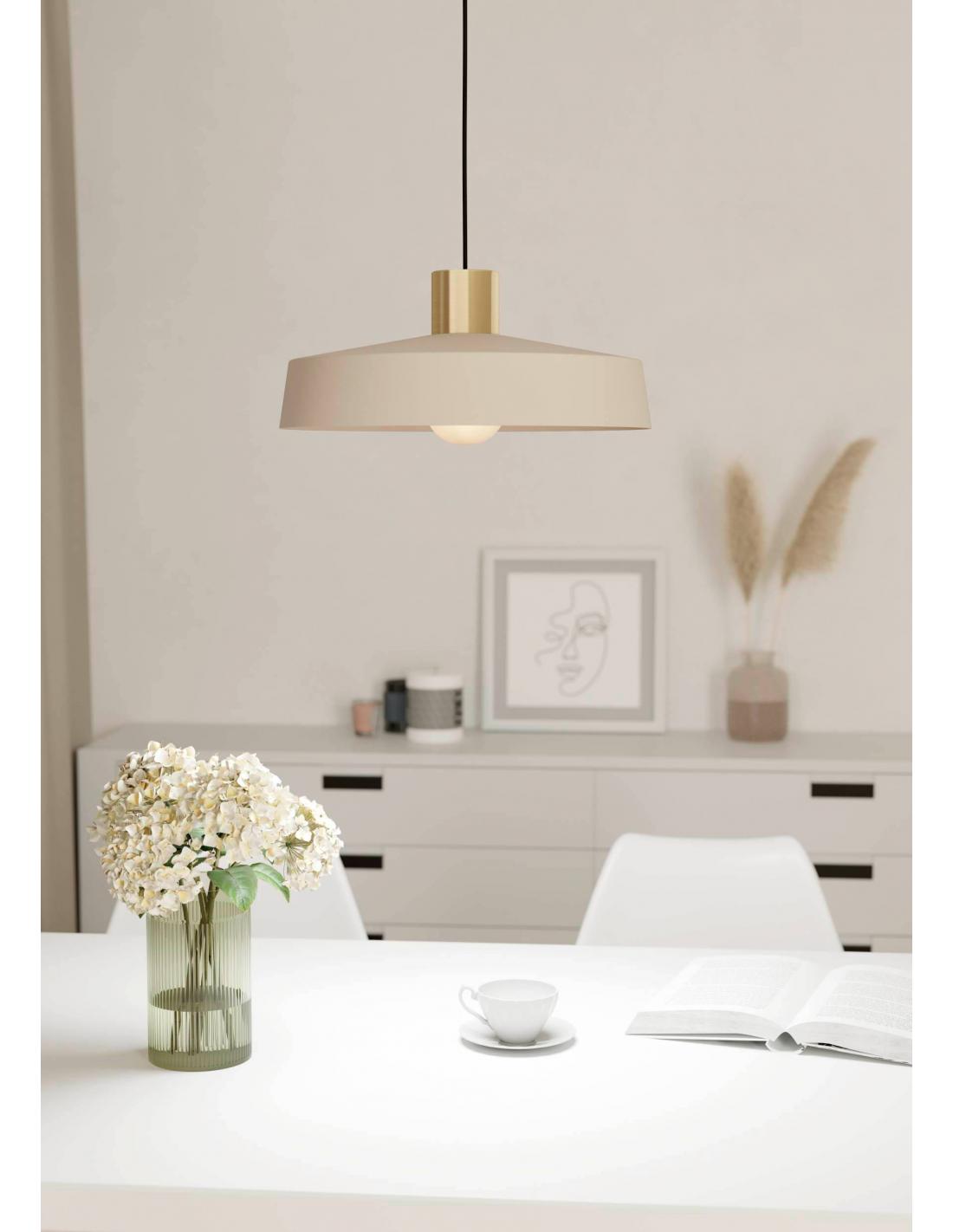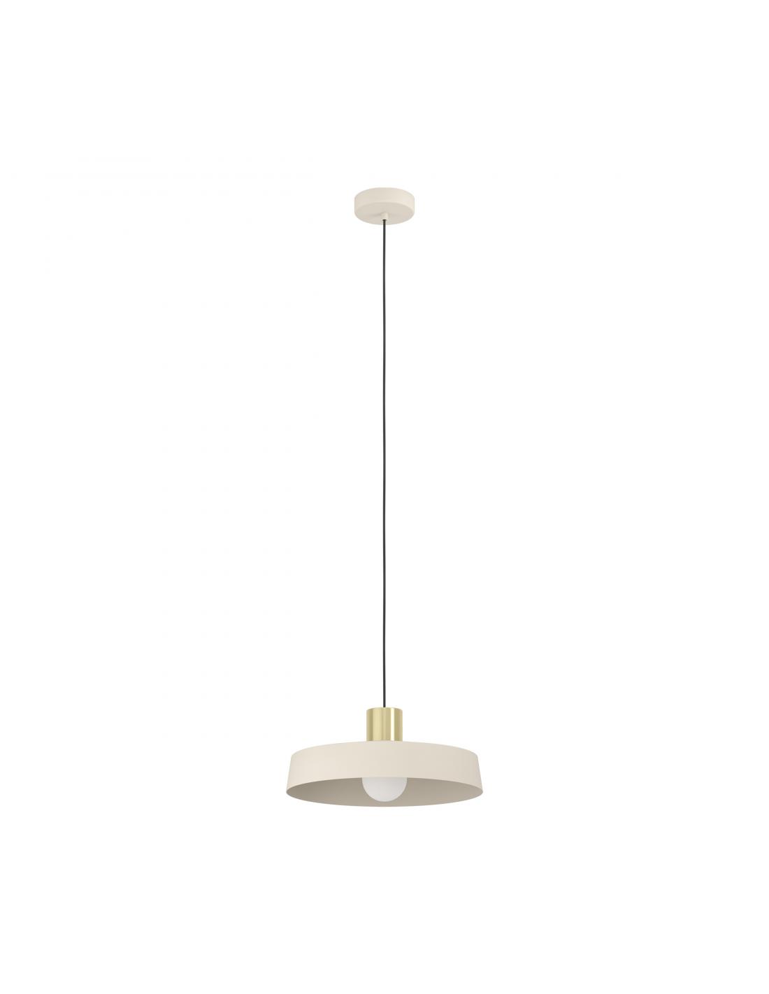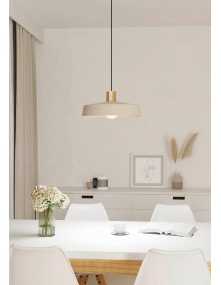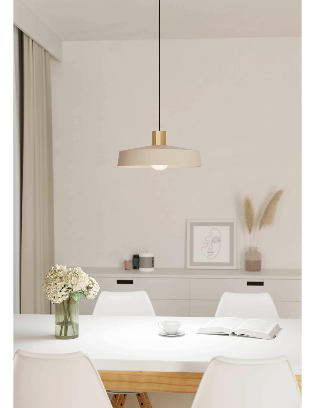 Steel pendant lamp, both its shade and its base, both in sand color with gold lamp holder and adjustable height cable in black color. It uses an E27 bulb, not included. Ideal for round and small dining tables, or using several for a wider table. A simple, modern and very beautiful lamp.