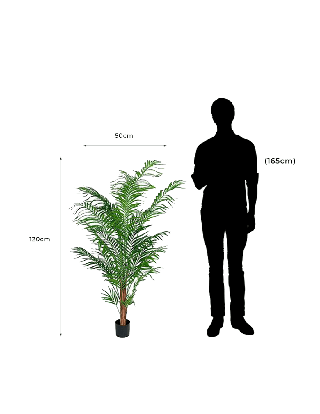 We recommend the use of our plants only indoors not exposed to the weather (direct sun and water). Our plants are foldable so the dimensions may differ.