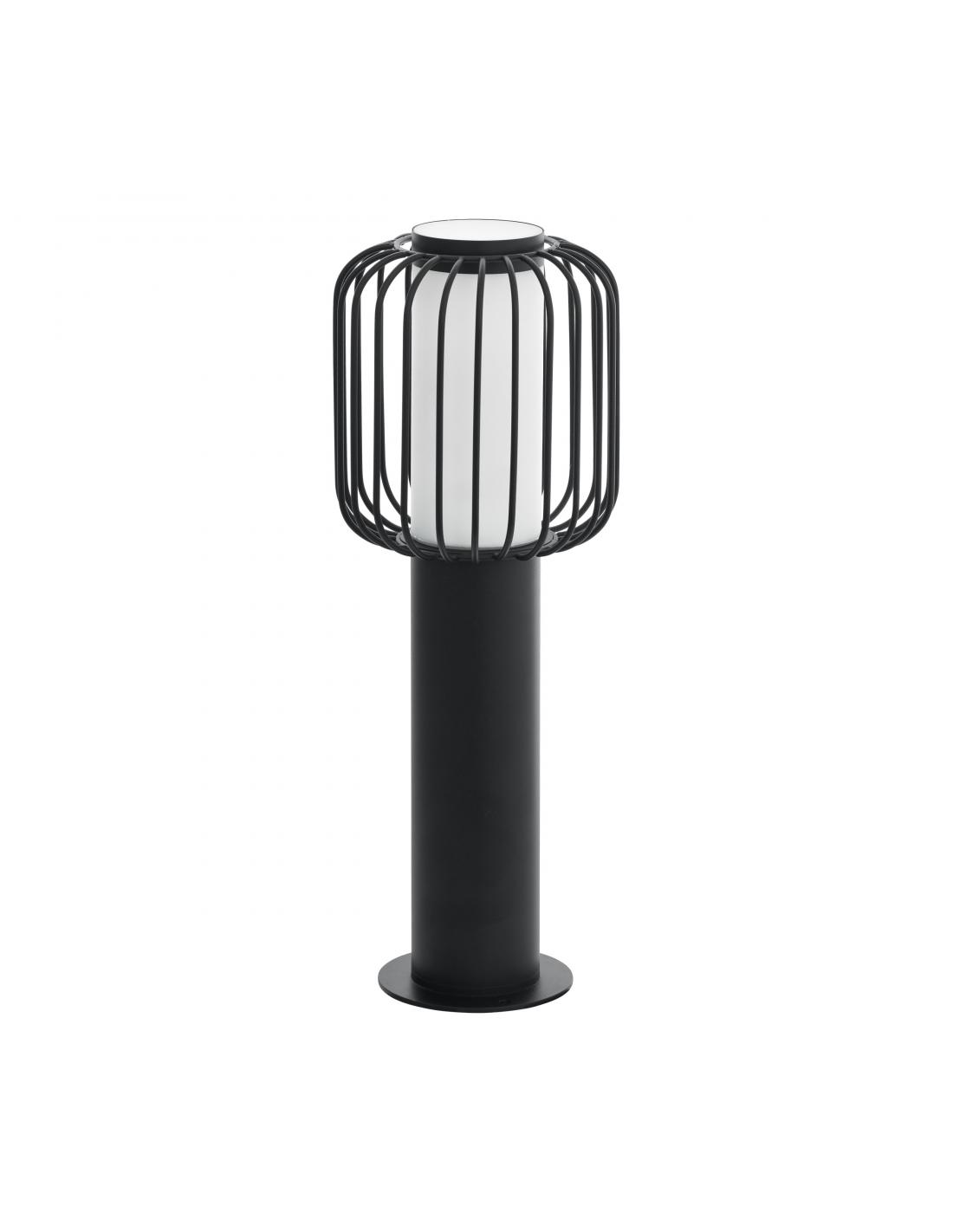 Beacon from the Ravello collection, ideal for outdoors with IP44, made of black galvanized steel with a cage-shaped head and opaline acrylic shade. Perfect for trail or path lighting. It uses an E27 bulb, not included.