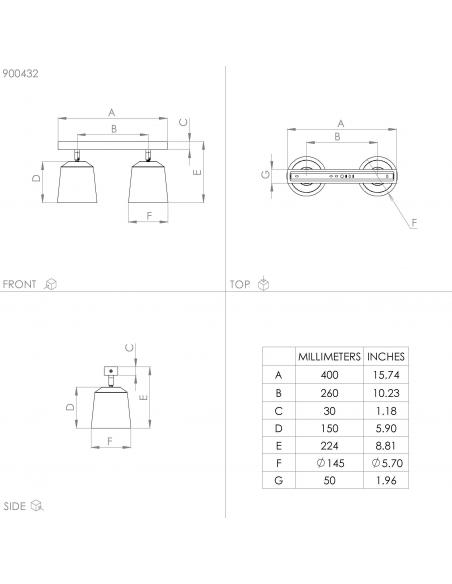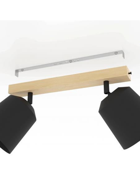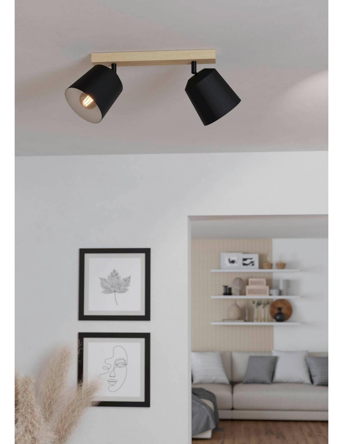 2-light ceiling spotlight with wooden beam and movable black steel shades. Ideal for living room, offices or small shops. It uses two e27 socket bulbs, not included.