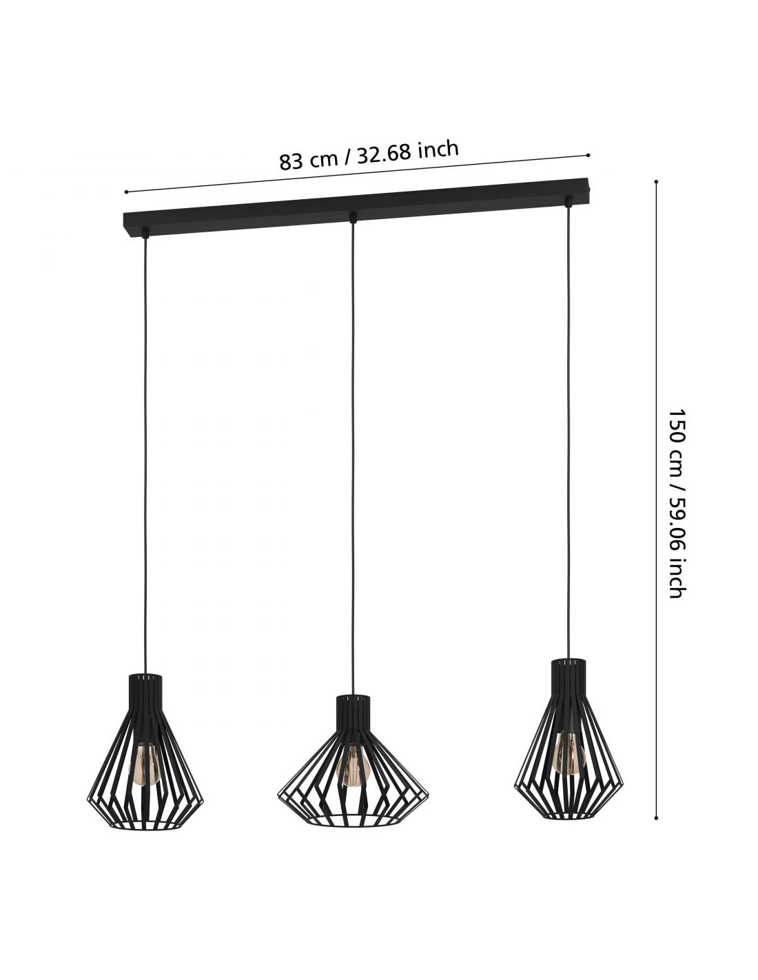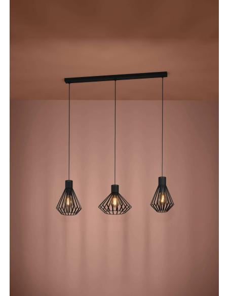 Black hanging lamp in steel with three diamond-shaped wire caged tulips, suspended from a black steel base with adjustable height wiring. A very beautiful lamp thanks to the effect of lights and leftovers that the lampshades create. It uses three E27 socket bulbs, not included.