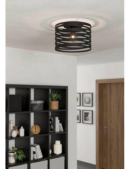 The CREMELLA ceiling lamp is made up of a round black metal shade. The spiral-shaped metal bands create fascinating plays of light and shadow as soon as the lamp is turned on. The ceiling light perfectly adapts to trends such as vintage and industrial decoration styles. It provides modern lighting in any room, whether in the kitchen, living room, bedroom or hallway. The filament bulb shown is not included. The lamp is suitable for any bulb with an E27 socket.