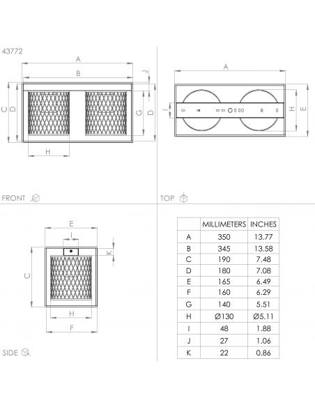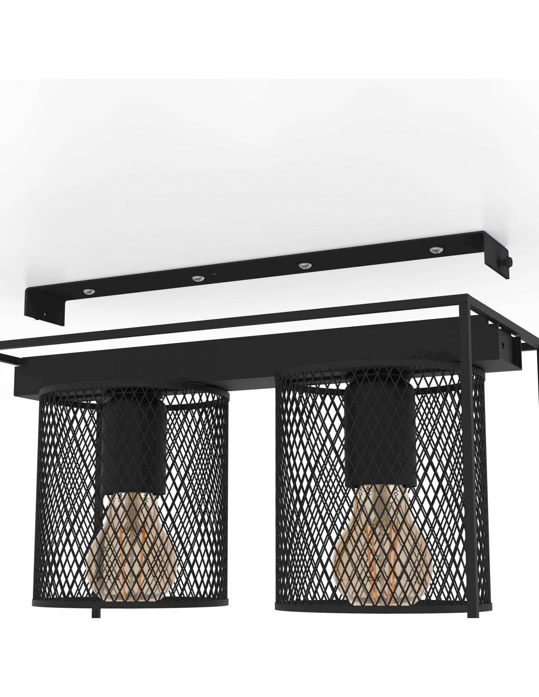 Two-light ceiling lamp made of black steel with rectangular geometric base, outer frame and grilled lampshades in the same material, which will create a magical effect by emitting very beautiful light. Ideal for a living room, passageways and even a bedroom. Requires 2 E27 bulbs, not included. Long live industrial deco!