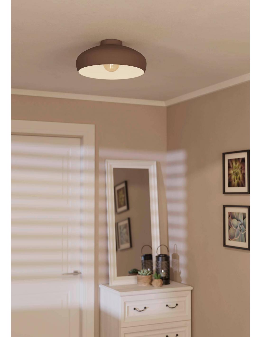 The MOGANO ceiling lamp is made with a round shade made of moka color metal and an interior part of the same color. With its monochromatic design, the ceiling lamp integrates perfectly into modern furniture. It offers minimalist lighting for every room, whether in the kitchen, living room, bedroom or hallway. The filament bulb is not included. The lamp is suitable for any bulb with an E27 socket.