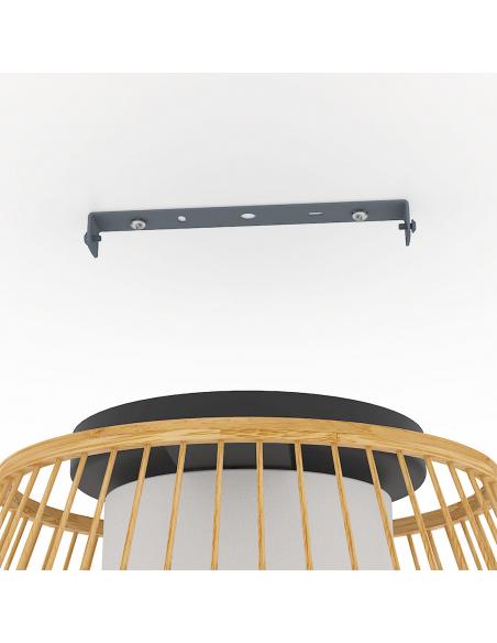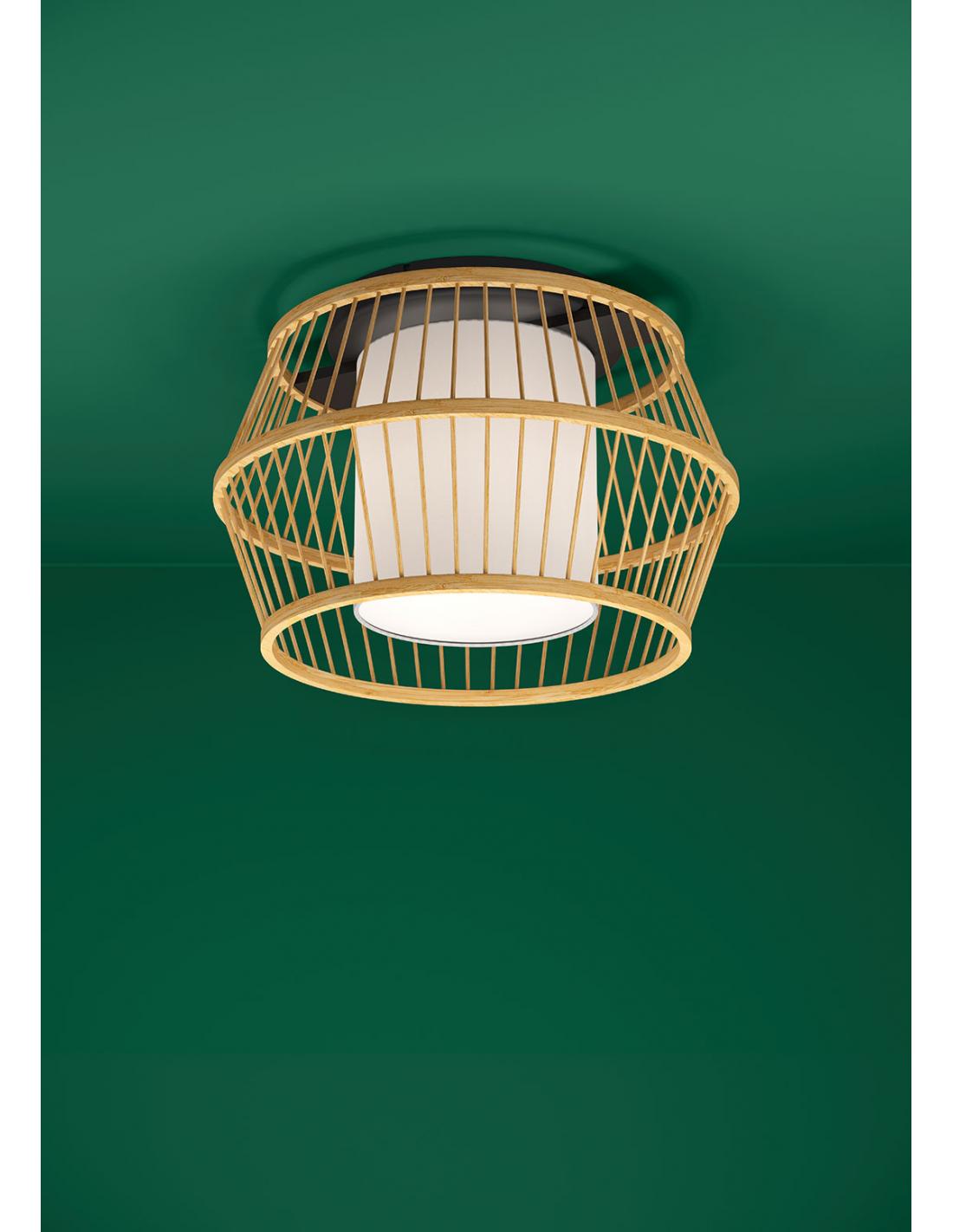 Ceiling lamp with wooden shade in cage format with rods that are arranged on 3 circles of the same material and inside it is installed an opal white glass shade on a black wooden base. A functional and very up-to-date ceiling lamp to decorate your home in a simple way. It uses an E27 socket bulb, not included.