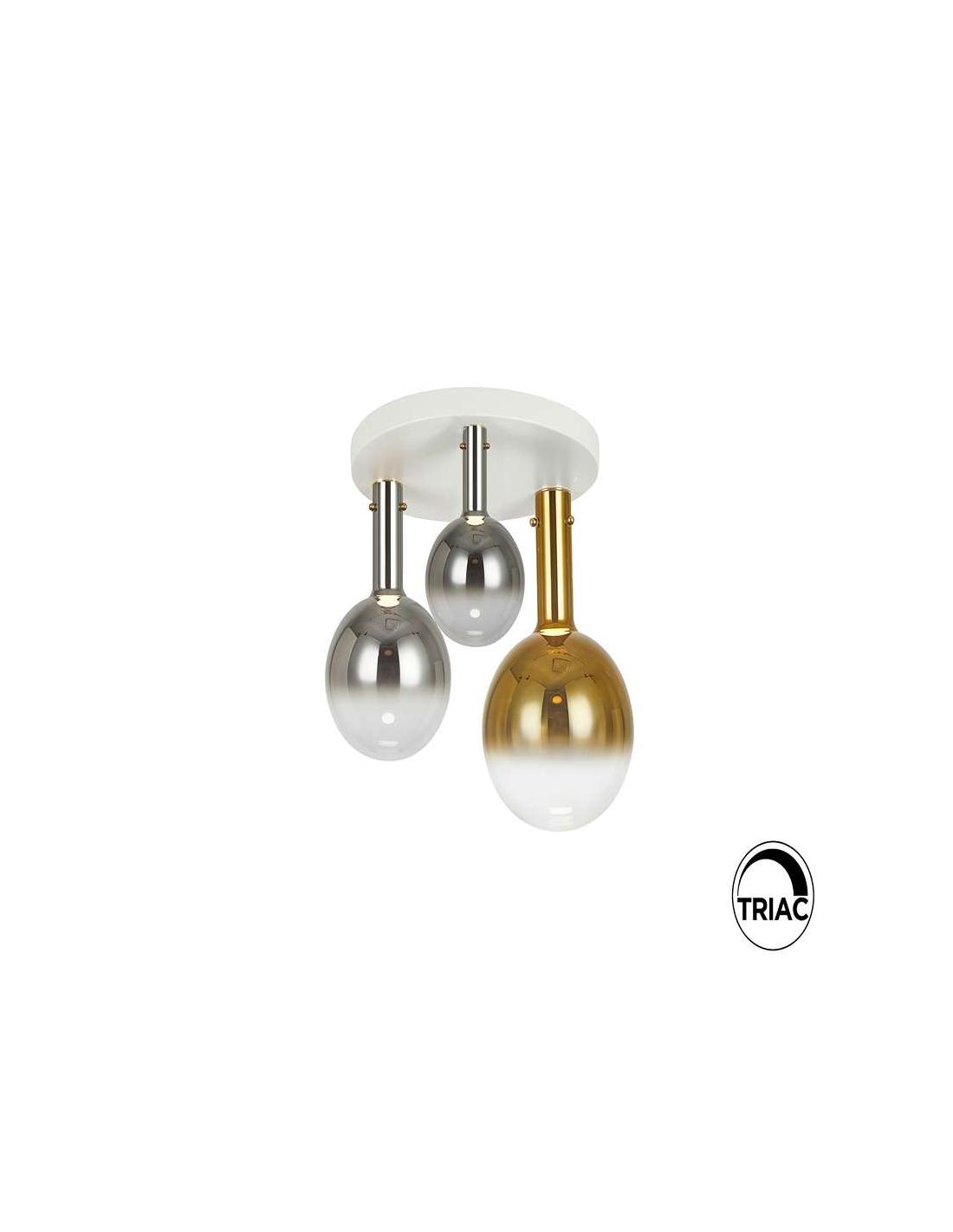 Ceiling light made of metal, matte white finish. Blown glass tulips of Ø15, 20 and 25 cm, mirrored smoke gray and mirrored gold. 15W LED, 1,542 lm, 3,000K.