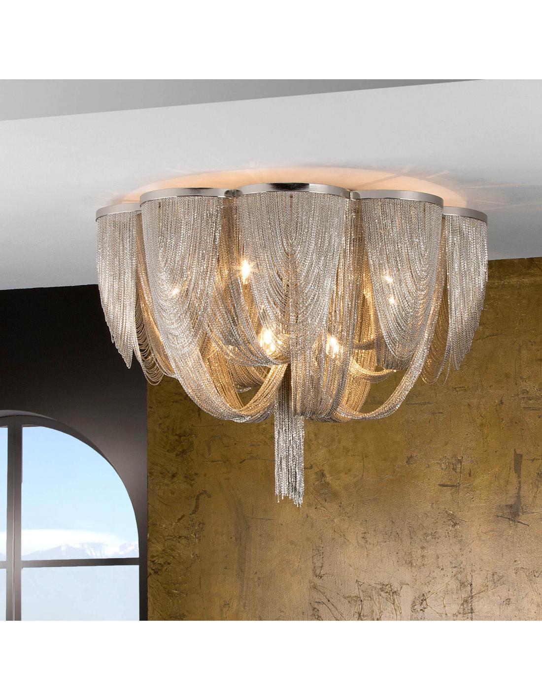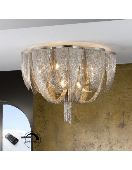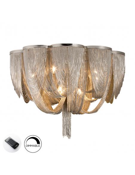 10-light ceiling light, composed of thin nickel-finished metal chains that form the body of the lamp. DIMMABLE. Includes remote control. This product includes a receiver dimer and a radio frequency remote control. ·Includes 10 G9 LED 4.5W. DIMMABLE