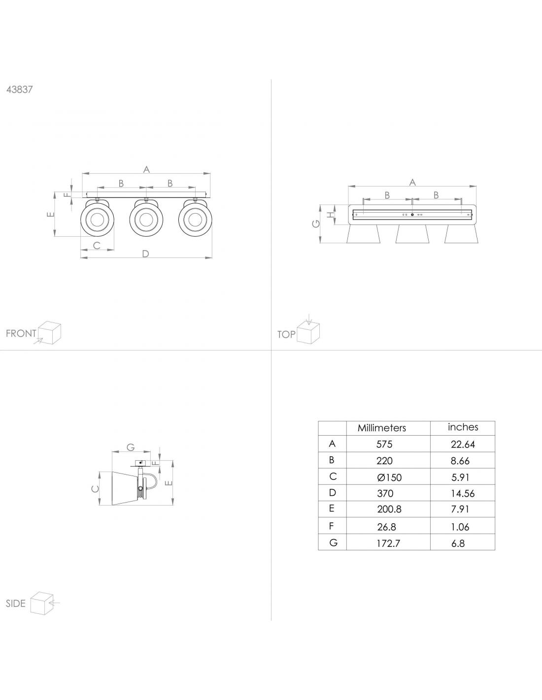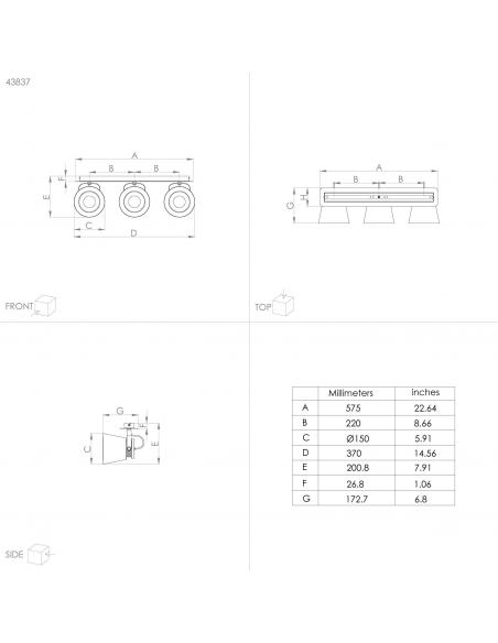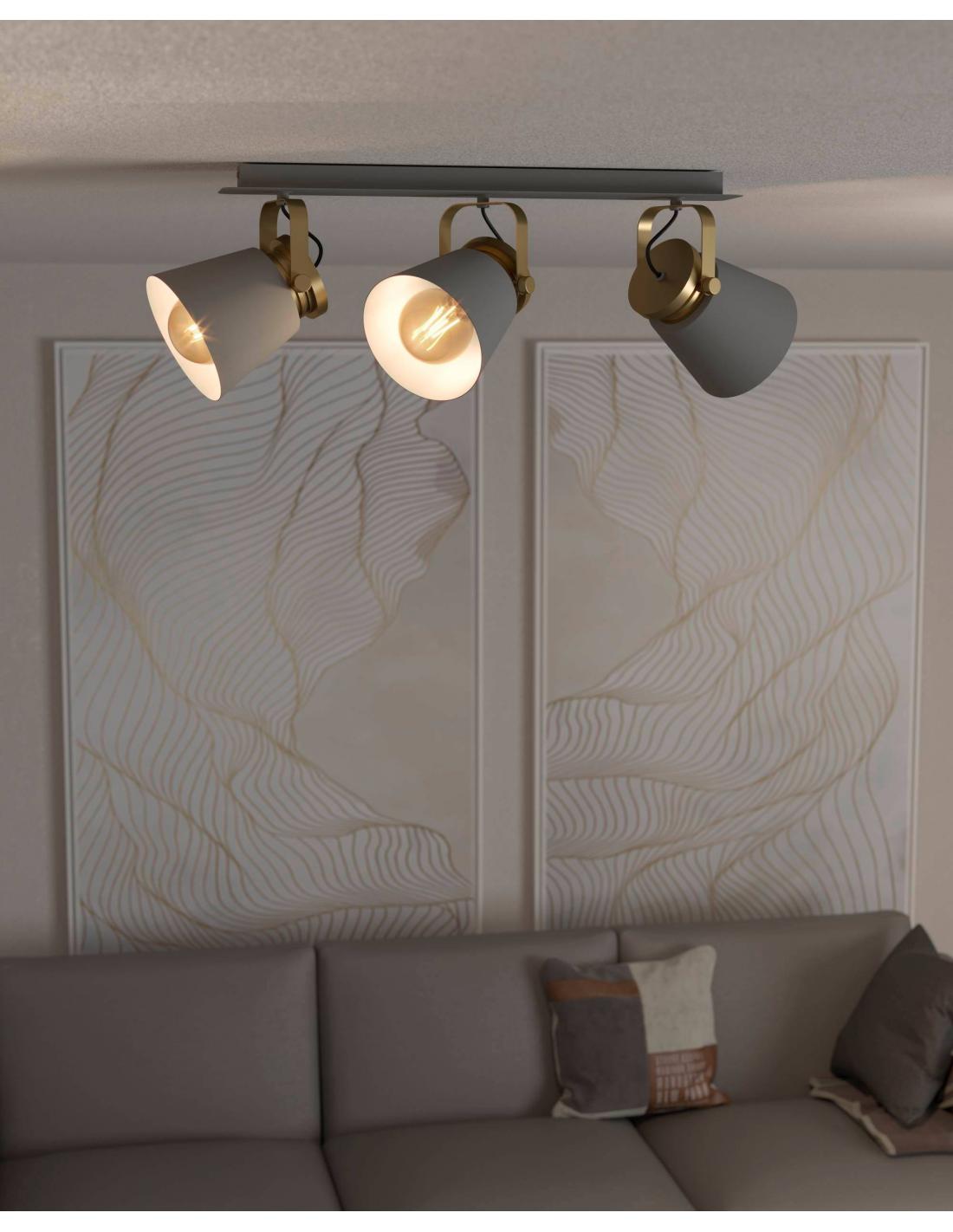 3-light spotlight made of steel structure and shades in gray color and articulated finishes in gold color. This lamp will be very useful to install in a living room or dining room, where you can distribute the light throughout the room and move the spotlights thanks to them being dirigible. Requires 3 e27 bulbs, not included.