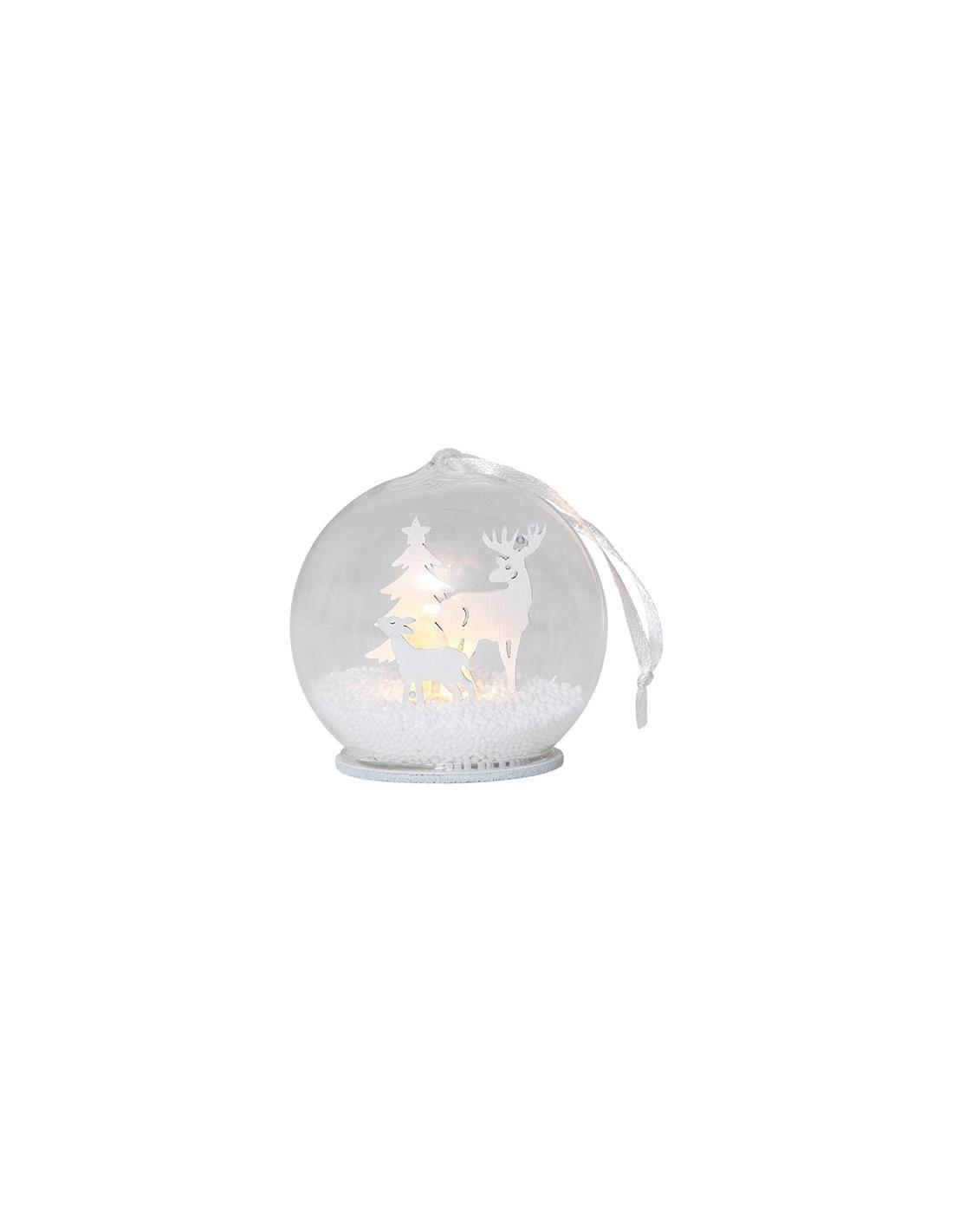 White glass ball with wooden decoration and snow-effect balls. Thanks to its warm light, you will decorate any corner to welcome Christmas in the best possible way. Happy Holidays! Works with battery, INCLUDED.