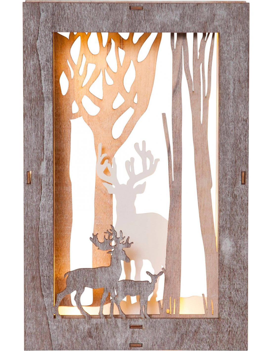 Object shaped like a wooden frame with images of reindeer in the forest. Decorate your home in a different way this year and add a magical touch thanks to its built-in warm light, which works with two AA batteries not included.