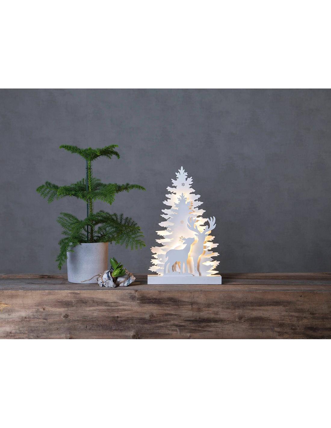 Elegant white Christmas decorative object made of carved wood in the shape of fir and reindeer. In addition, it includes warm light to bring a unique touch to your home. The light works with 2 AA batteries, not included