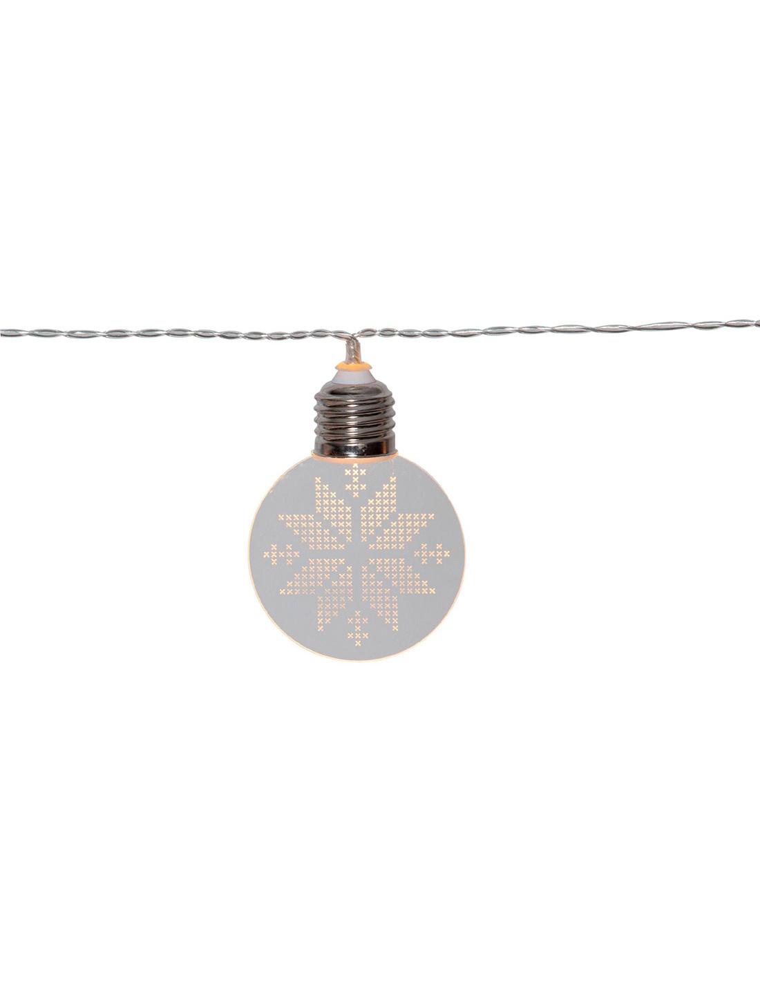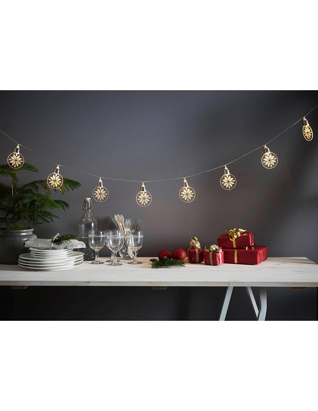 Christmas garland with warm light snowflake drawing. The shape of a bulb with a socket creates a very different effect of Christmas balls, ideal to place high or on the table for gifts, desserts... You decide! Works with 3 AA batteries, not included. It has a timer function so that it is on for 6 hours, turns off automatically, and turns on again the next day (18 hours). Don't worry about plugging everything in!