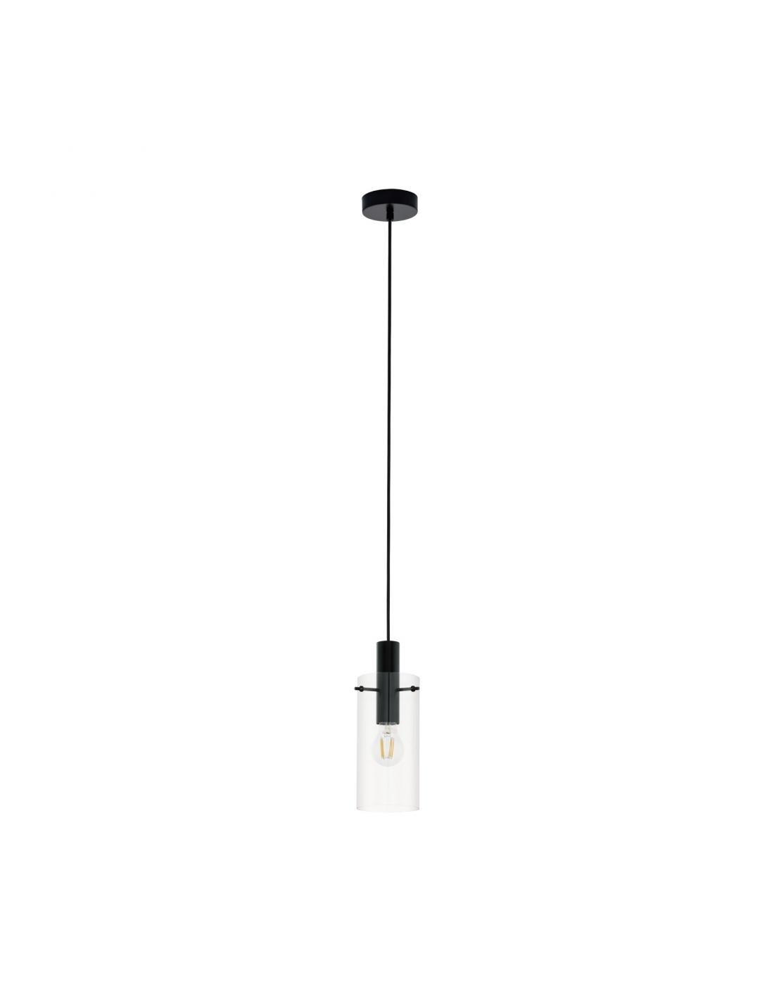 Hanging lamp made of glass and steel from the Montefino collection. This cylindrical glass shade lamp is suspended from a steel lamp holder with 4 rods that are fitted to the glass and above them a black height-adjustable cable, matching the steel rosette of the same color. A simple, elegant and functional piece, which works with an E27 socket bulb, not included.