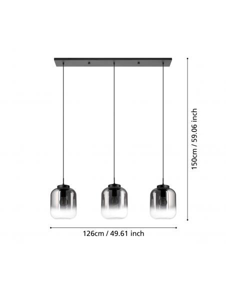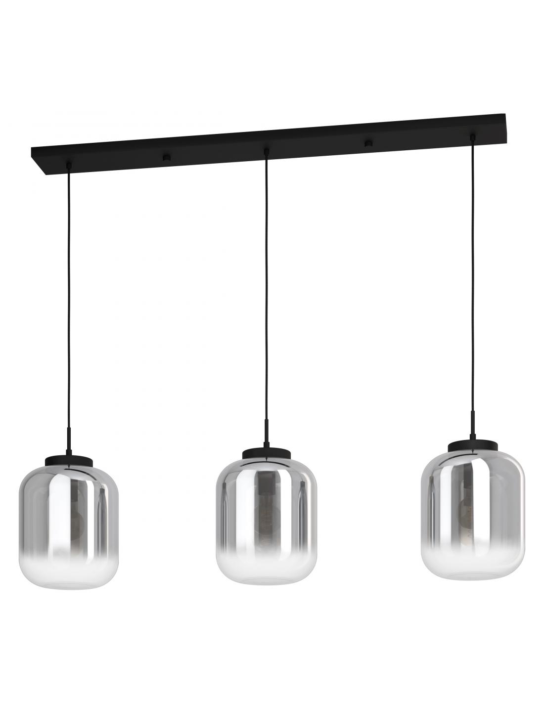 The BULCIAGO pendant lamp is made up of three large black transparent glass tulips (fumé) and a black metal suspension. The pendant lamp fits perfectly into any modern decoration style. The lamp provides elegant lighting in any room, whether in the living room or over the dining table. The filament bulbs shown are not included. The lamp is suitable for any bulb with an E27 socket.