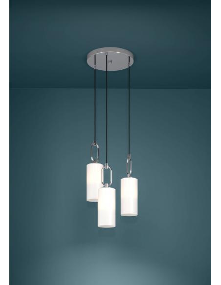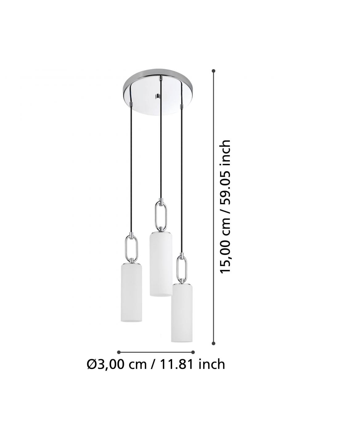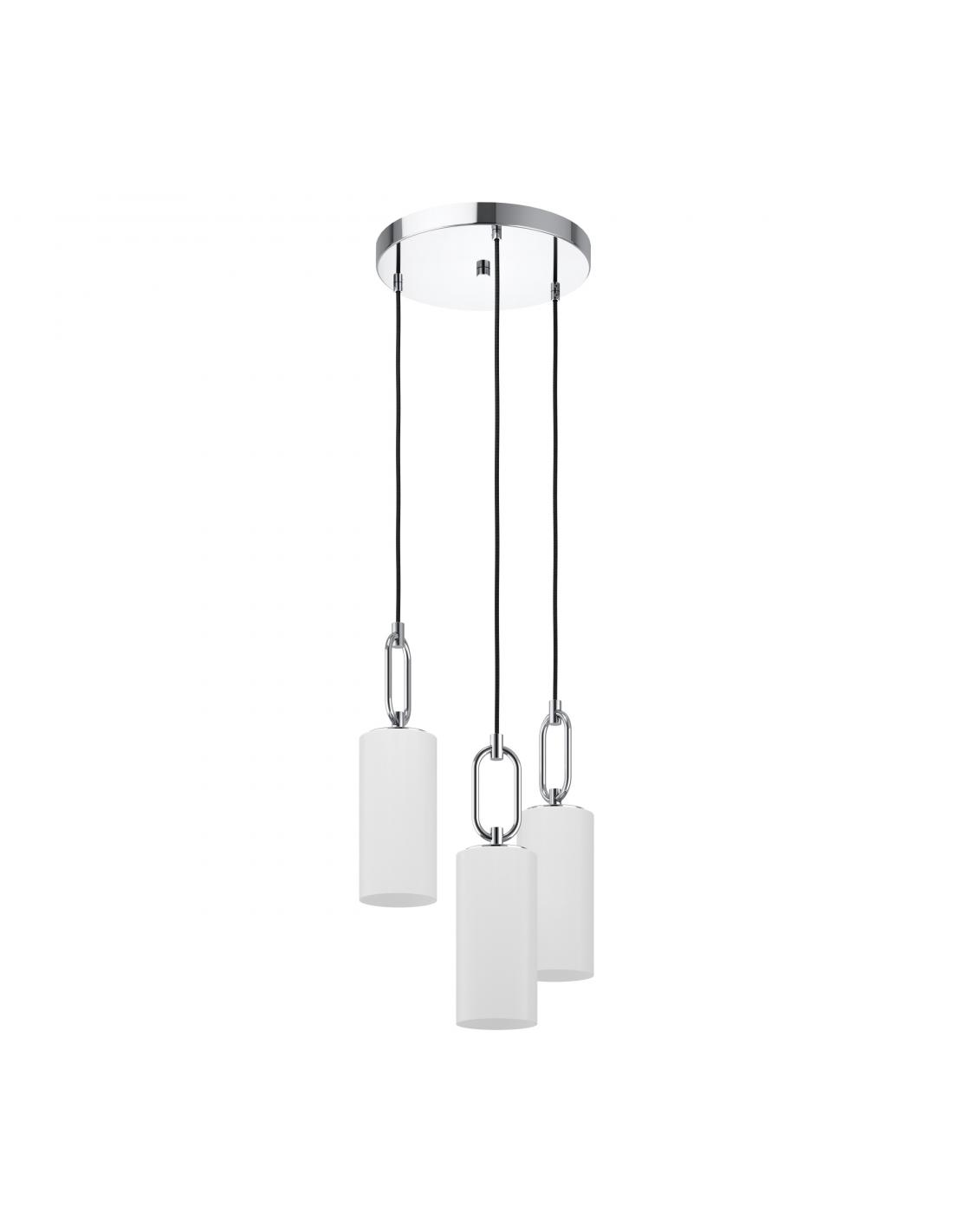 The MAJANA pendant lamp is made up of three cylindrical shades of matte opal glass in white, which are suspended from a round metal canopy in chrome colors at different heights with black textile cables. The combination of the shades with the oval chrome support gives the lamp its special look. Thanks to its elegant design, it looks good in different decoration styles and offers modern lighting in the living room or dining room. Bulbs are not included. The lamp is suitable for any bulb with an E27 socket.