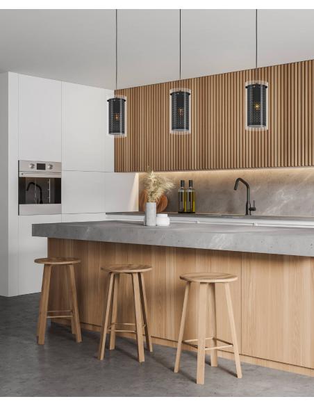 The PINTO TEXTIL 1 pendant lamp consists of a cylindrical glass shade, which is suspended from a metal canopy of the same color with a black textile cable. The black fabric inner body has fine cutouts and, when switched on, creates a fascinating play of light and shadow in the room. Thanks to its cozy design, the pendant lamp can be combined with almost any style of decoration and offers elegant lighting in the living room or dining room. The bulb is not included. The lamp is suitable for any bulb with an E27 socket.