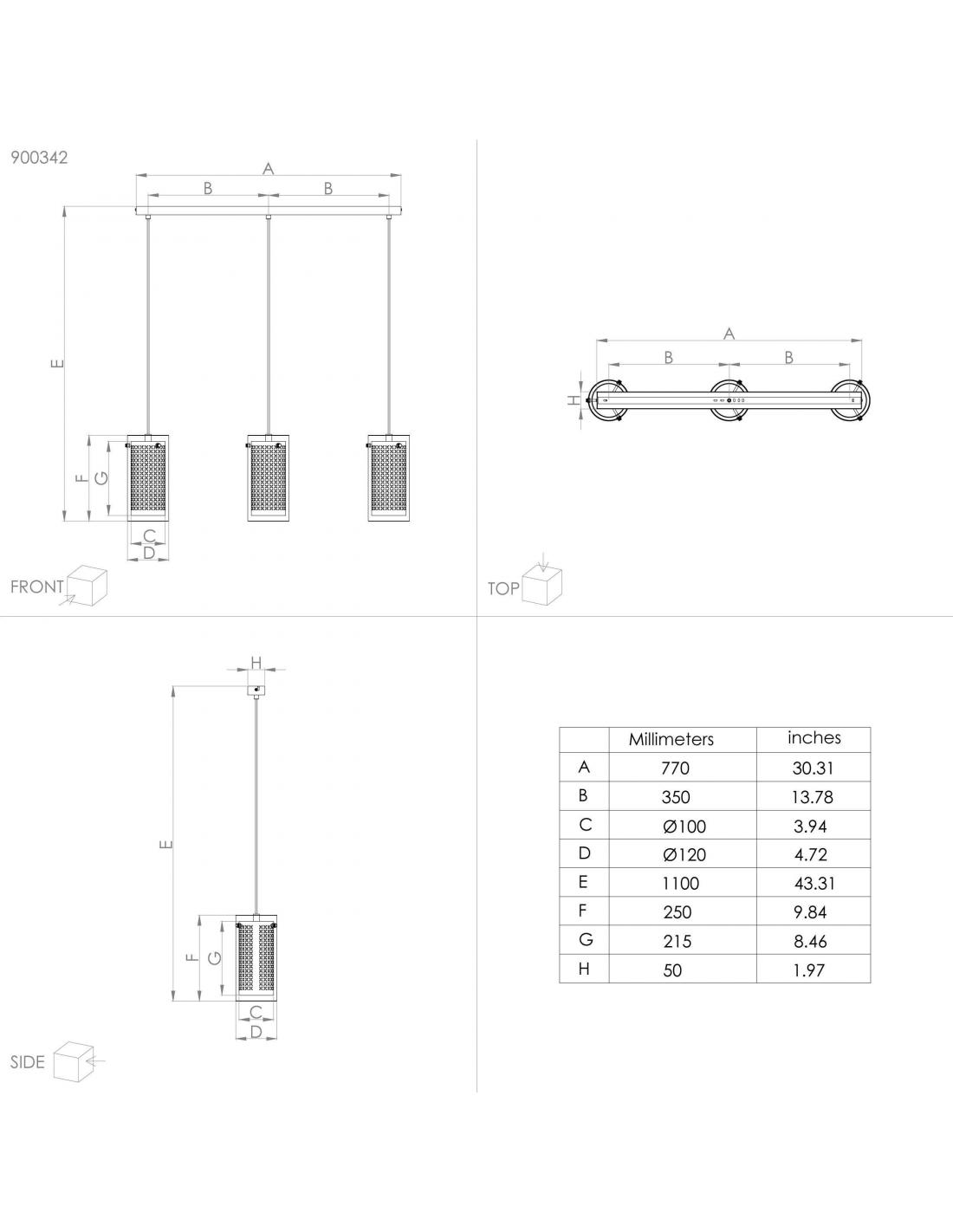 The PINTO TEXTIL 1 pendant lamp consists of three cylindrical glass shades that are suspended from an elongated metallic canopy of the same color with black textile cables. Each black fabric interior has fine cutouts and, when switched on, creates a fascinating play of light and shadow in the room. Thanks to its cozy design, the pendant lamp can be combined with almost any decoration style and offers elegant lighting in the living room or dining room, for example, above an elongated dining table. Bulbs are not included. The lamp is suitable for any bulb with an E27 socket.
