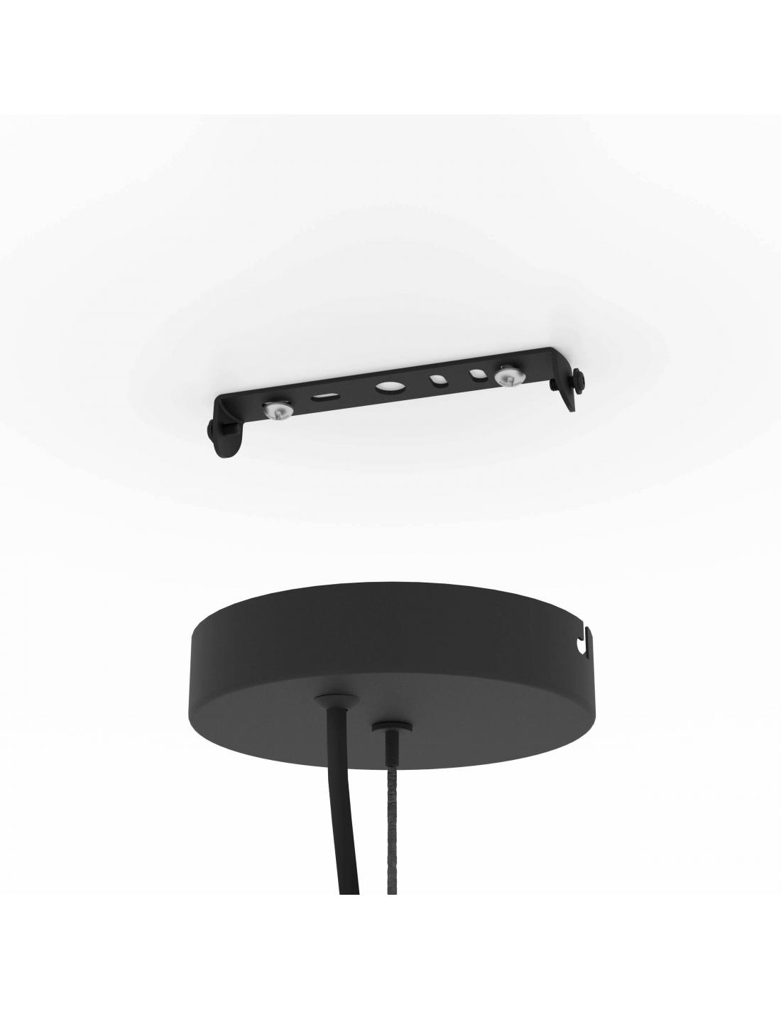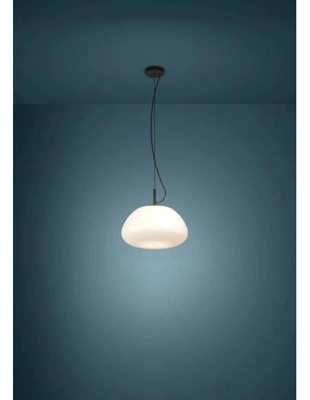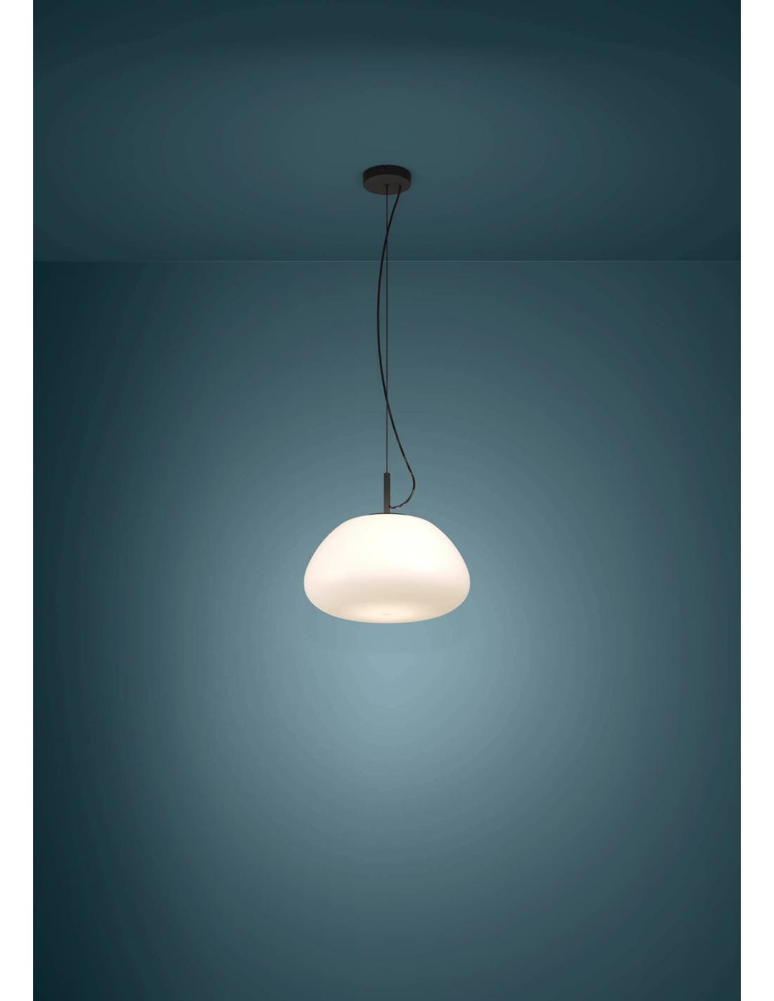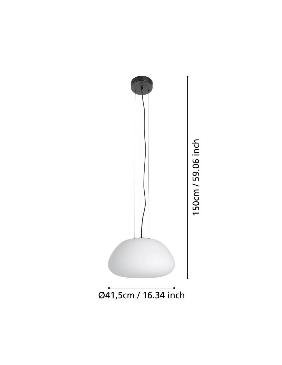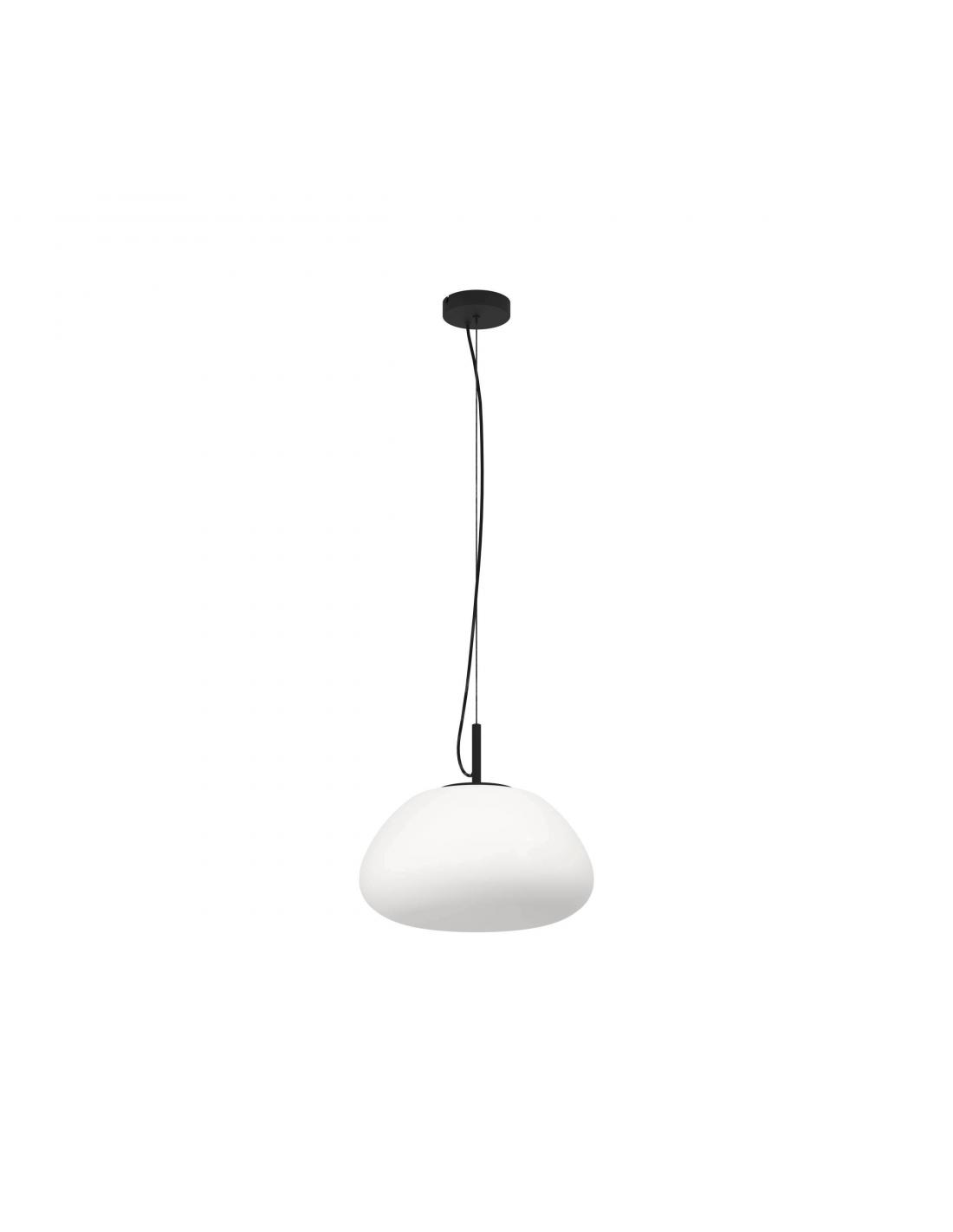 Pendant lamp with a beautiful matte opal glass shade in a domed shape and wired and base in black color that allows the contrast and modernity of the piece. The base is made of steel and the lamp has the electricity cable along with a fastening cable, which in addition to adding greater security in the holding of the glass gives it a very modern and different decorative touch from conventional hanging lamps. It uses an E27 socket bulb, not included.