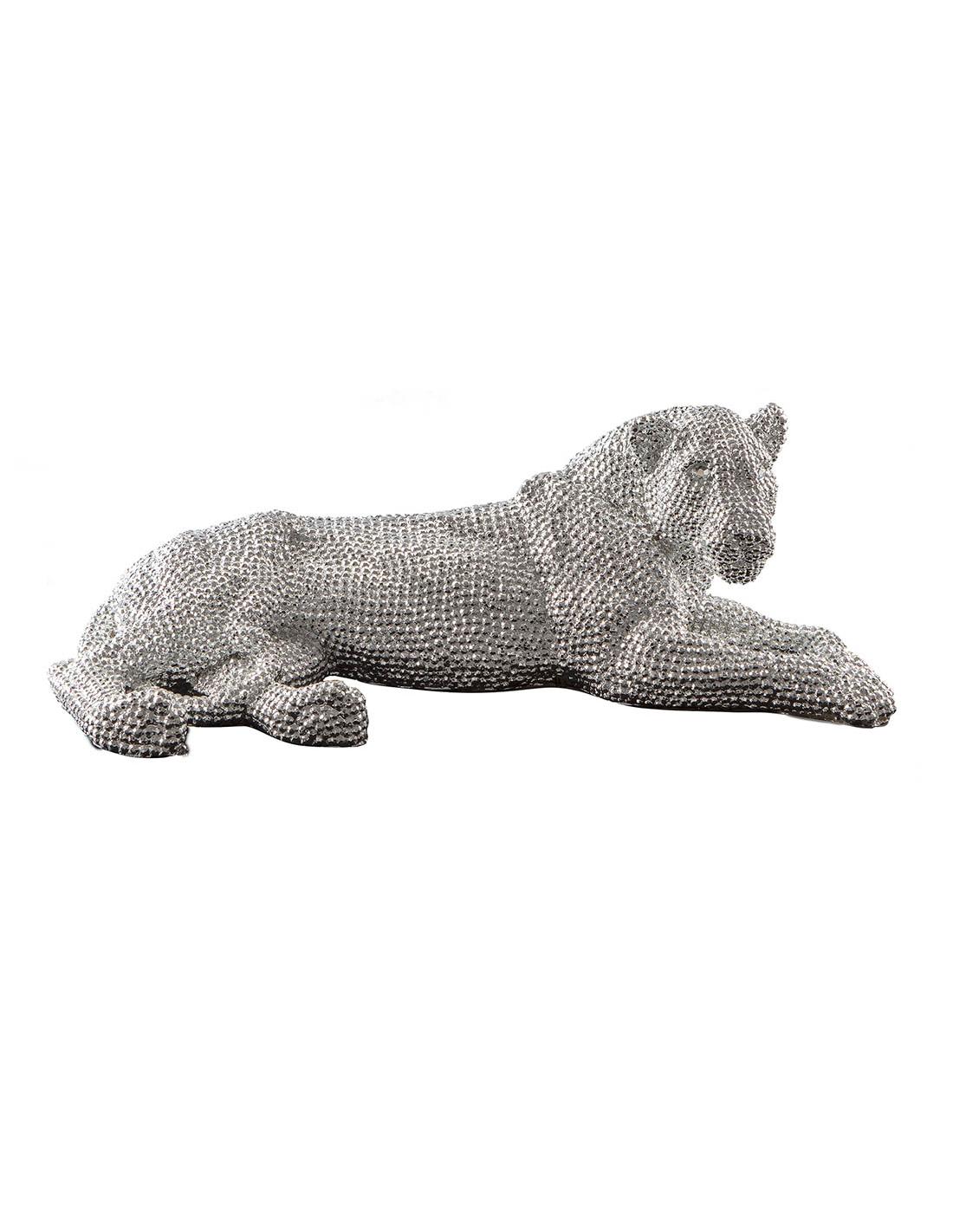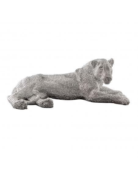 Small figure of a lying lioness, made of polyresin. Finished in silver with a texture imitating rhinestone inlays.