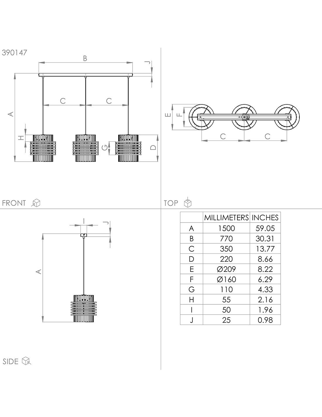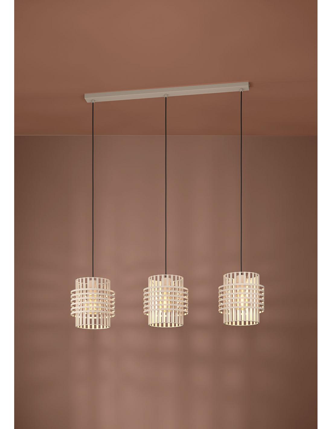 3-light pendant lamp with three rounded lampshades made with flat metal strips horizontally and vertically in sand color, and made of steel. These screens, which create a very beautiful light effect, are suspended on height-adjustable wiring and installed on a sand-colored steel base. Requires 3 E27 socket bulbs, not included.
