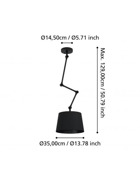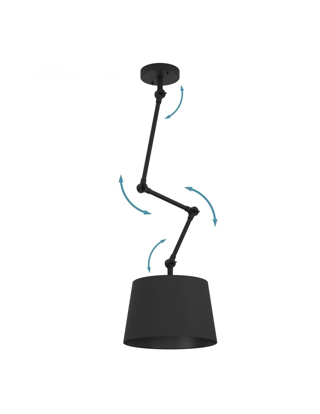 The PISTUNIO ceiling lamp is made of black metal with a textile shade of the same color. The long lamp arm with four movable joints allows the height or position of the lampshade to be individually adjusted, so that ideally lit accents can be created in the room in no time. The monochromatic design ceiling lamp integrates perfectly into modern industrial style furniture and offers special lighting in your living room. The bulb is not included. The lamp is suitable for any bulb with an E27 socket.