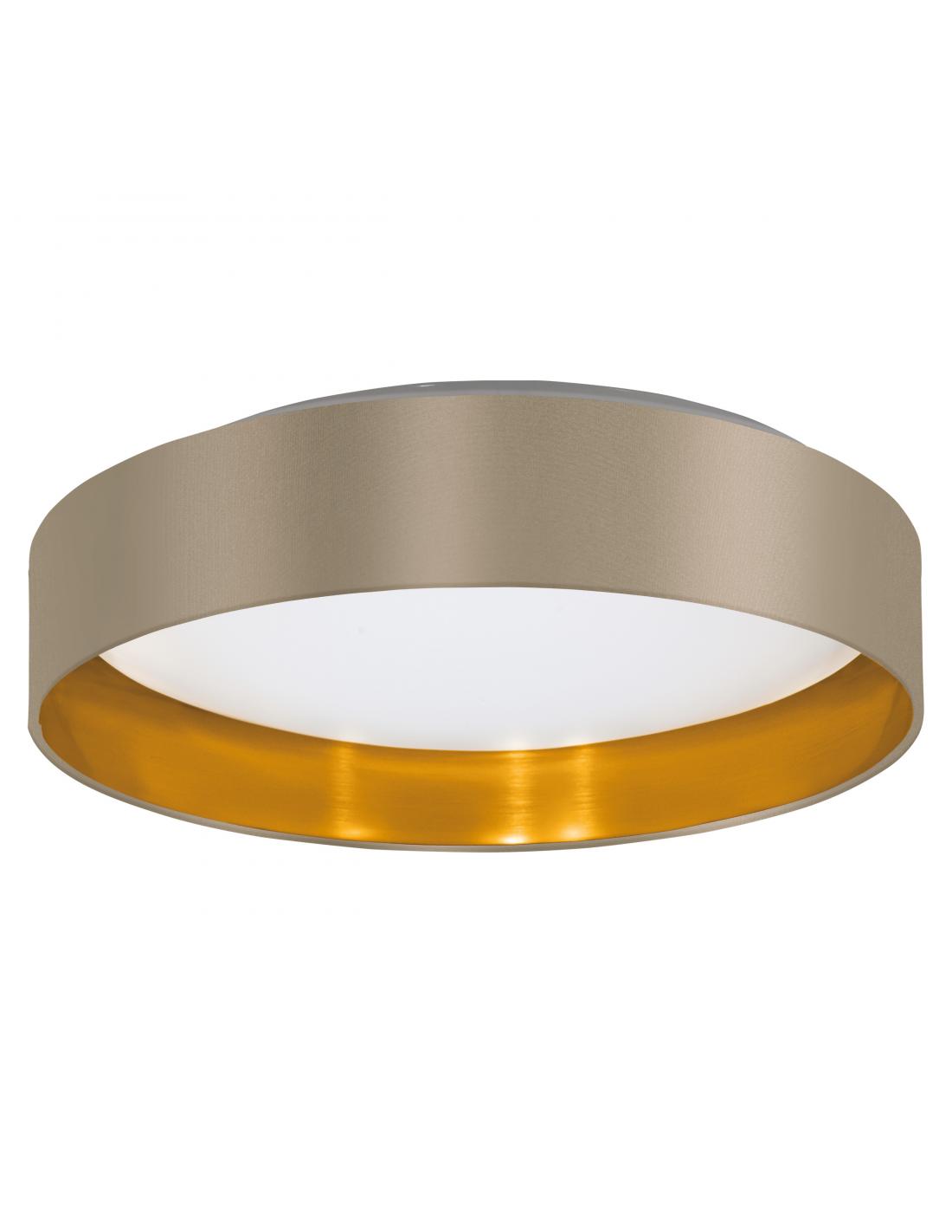 MASERLO 2 lamp. Perfect lamp for living room, made by EGLO, with a white steel structure, champagne and gold fabric shade inside and white acrylic protective screen. Its integrated led emits a warm neutral light of 3000k and 2100 lumens, with 24W of power.