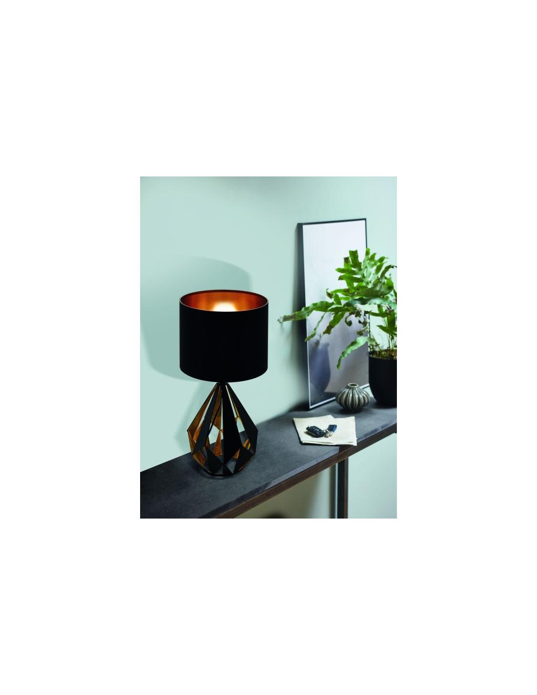Table lamp from the CARLTON collection. The base is made with geometric sheets in black steel with a copper interior. The shade is made of black fabric with an interior also in copper, which gives a much more elegant look to the piece. It uses an E27 bulb, not included. One of our best-selling bedside table models.