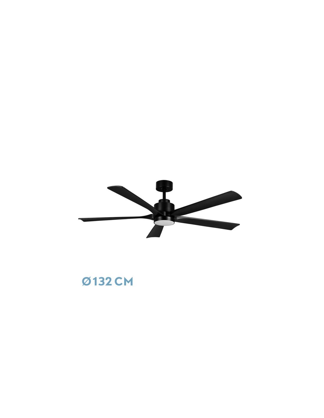 Fan DC from the CAIRO series made of metal, wood and polycarbonate, in BLACK color with five blades. It has six adjustable speeds with DC motor. Built-in LED technology with a power of 24W, with 3 SELECTABLE LIGHT TEMPERATURES (3000-4500-6000K) and 2400 lumens. Modern and elegant design, large size, ideal for living rooms, dining rooms, open spaces and work areas. It has dimensions of 34.5/47x132x132 centimeters, includes two SEATPOST measurements (12.5 cm and 25 cm), which allows it to be adapted to different heights. Summer or winter air control. Remote control INCLUDED with built-in COLOR MEMORY and 1/2/4/8 H TIMER. Model available in white/beech, black and white.