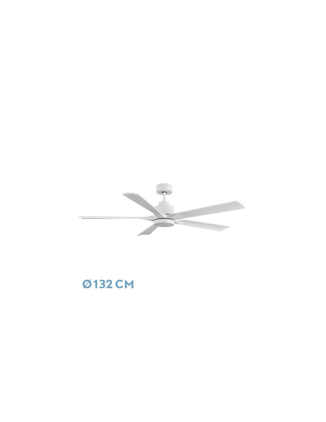 Fan DC from the CAIRO series made of metal, wood and polycarbonate, in WHITE color with five blades. It has six adjustable speeds with DC motor. Built-in LED technology with a power of 24W, with 3 SELECTABLE LIGHT TEMPERATURES (3000-4500-6000K) and 2400 lumens. Modern and elegant design, large size, ideal for living rooms, dining rooms, open spaces and work areas. It has dimensions of 34.5/47x132x132 centimeters, includes two SEATPOST measurements (12.5 cm and 25 cm), which allows it to be adapted to different heights. Summer or winter air control. Remote control INCLUDED with built-in COLOR MEMORY and 1/2/4/8 H TIMER. Model available in white/beech, black and white.