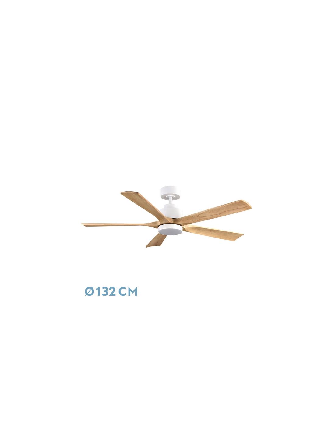 Fan DC from the CAIRO series made of metal, wood and polycarbonate, in WHITE color with five HAYA color blades. It has six adjustable speeds with DC motor. Built-in LED technology with a power of 24W, with 3 SELECTABLE LIGHT TEMPERATURES (3000-4500-6000K) and 2400 lumens. Modern and elegant design, large size, ideal for living rooms, dining rooms, open spaces and work areas. It has dimensions of 34.5/47x132x132 centimeters, includes two SEATPOST measurements (12.5 cm and 25 cm), which allows it to be adapted to different heights. Summer or winter air control. Remote control INCLUDED with built-in COLOR MEMORY and 1/2/4/8 H TIMER. Model available in white/beech, black and white.