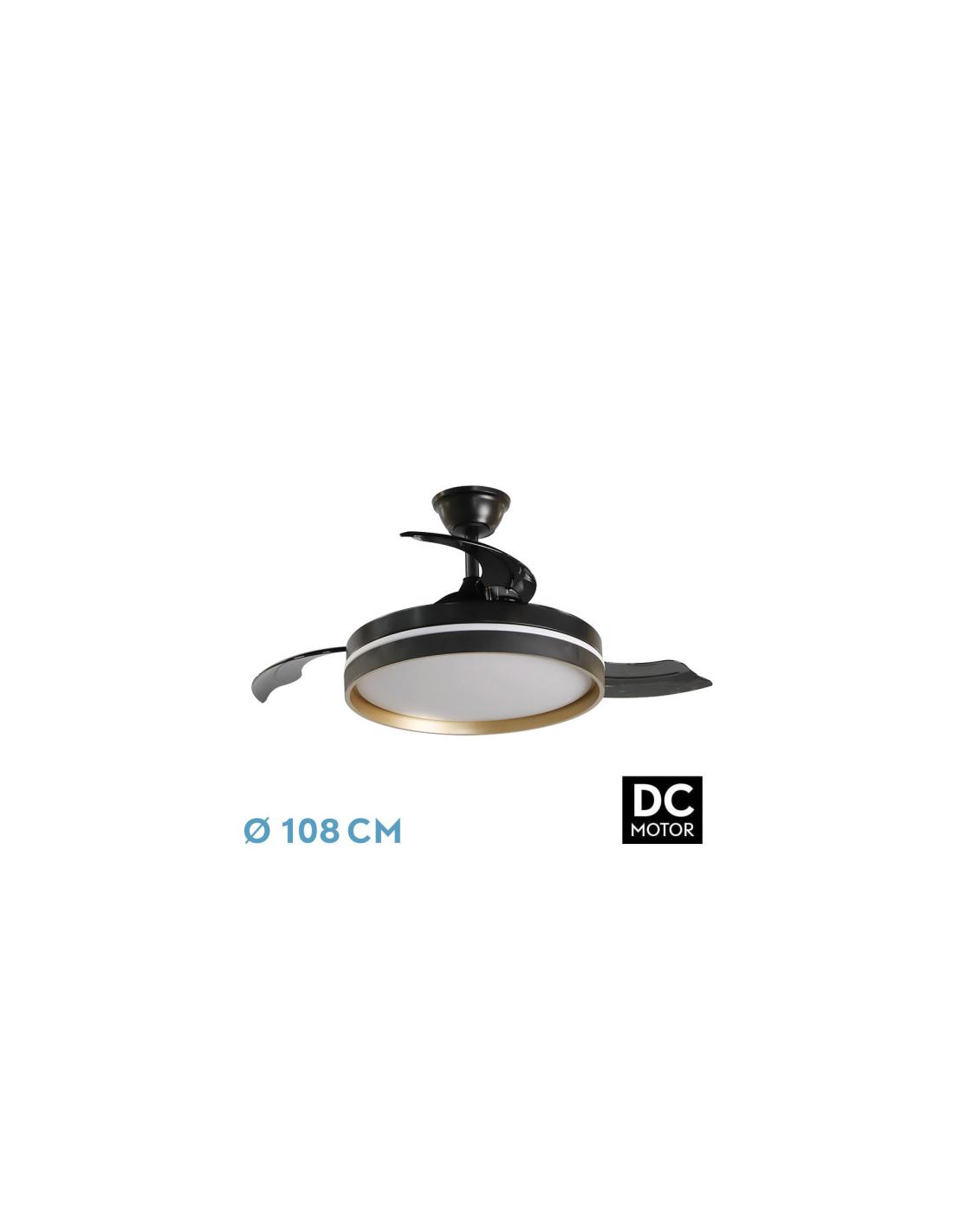 DCFan from the MANDARIN series made of metal, ABS and polycarbonate, in BLACK/GOLD color with three very resistant transparent ABS FOLDING blades . Very modern and innovative design, very much in line with multiple decoration styles, serving as both a lamp and fan. DC motor. It has six adjustable speeds. Integrated LED technology with a power of 72W, with 3 LIGHT TEMPERATURES (3000-4000-6500K) and 7200 lumens. Summer or winter air control. Its measurement is 31/46x48x48 centimeters with the blades folded and 31/46x108x108 centimeters with the blades unfolded, with two stem measurements to install it at different heights. ADJUSTABLE IN INTENSITY, with remote control INCLUDED, built-in color memory and TIMER to program its shutdown after 2 hours. Model available in white, silver and black/gold.