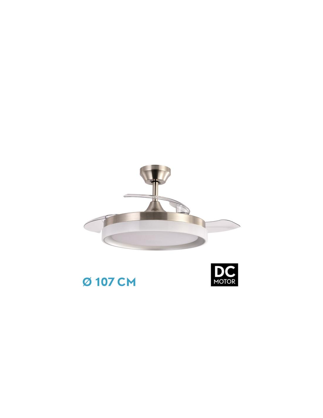 Fan DC from the ZENIT series in NICKEL color with three very resistant FOLDING BLADES . Made of metal, ABS and polycarbonate, with a modern design, very original and elegant. It has six adjustable speeds. DC motor. Integrated LED technology with a power of 72W, 7200 lumens and 3 SELECTABLE LIGHT TEMPERATURES (3000-4500-6000K), warm light, natural light and cold white. Summer or winter air control. Its measurement is 36.5/49X49 centimeters with the blades folded and 36.5/49X107 centimeters with the blades unfolded, it comes with TWO SEATPOST MEASUREMENTS to place at different ceiling heights. Remote control INCLUDED with COLOR MEMORY and 1/2/4/8 H TIMER . Model available in leather, white, black and nickel color .