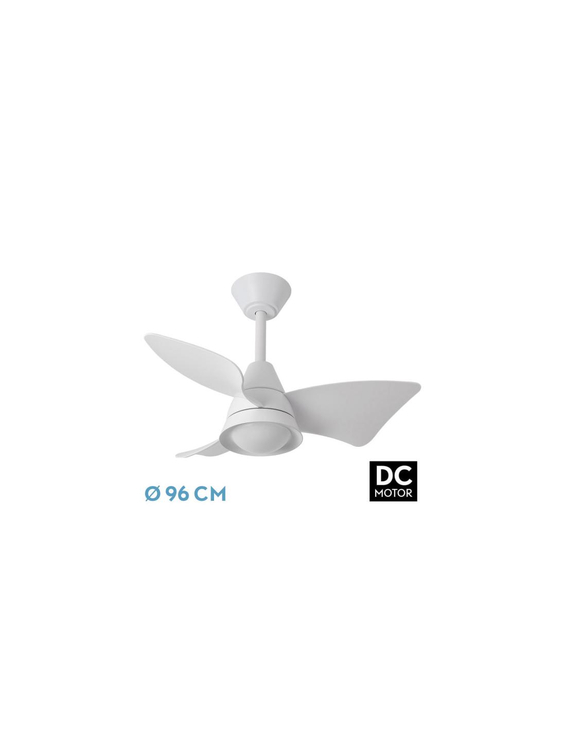 Fan DC from the JAGUAR series made of metal, ABS and polycarbonate, in WHITE color with three blades. It has six adjustable speeds. DC Motor. Built-in LED technology with a power of 30 watts, with 3 LIGHT TEMPERATURES (3000-4500-6500K) and 3000 lumens. Modern and original design. Its measurement is 48X96X96 centimeters. Summer and winter air control. ADJUSTABLE IN INTENSITY, with INCLUDED remote control, built-in color memory and 1/4/8 H TIMER. Its voltage ranges from 186 to 265 watts, which resists voltage rises and falls in a very wide field without suffering any damage. Model available in black, white, white/beech and black/oak.