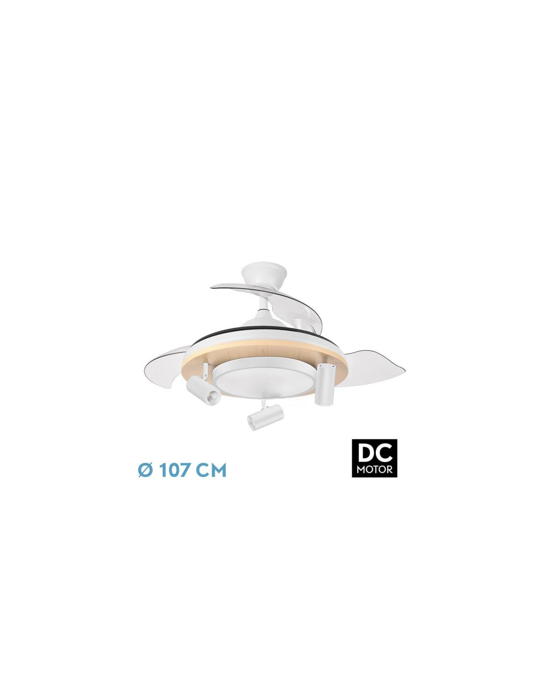 Fan DC from the GLADIATOR series made of metal, polycarbonate and ABS, in WHITE/BEECH color with three very resistant transparent ABS DEPLOYABLE blades . Very modern and original design, with three led spotlights that add 15 watts of power in 4500k (natural white) in its structure with independent ignition to the main light from its remote to direct the light. It has six adjustable speeds. Its main light also has integrated LED Technology with a power of 37W, with 3 SELECTABLE LIGHT TEMPERATURES (3000-4500-6500K) and 3980 lumens. Summer or winter air control. Its measurement is 32/47X50 centimeters with the blades folded and 32/47X107 centimeters with the blades unfolded. Includes two rods of 10 and 25 centimeters, to be placed at different heights. Remote control INCLUDED, and in its MAIN light it is ADJUSTABLE IN INTENSITY, with built-in COLOR MEMORY and TIMER 1 H to 8 H. You can use the control VIA APP: FAN LAMP PRO, from which you can also manage your fan easily and intuitively from your mobile. Model available in white/beech and black/wood color.