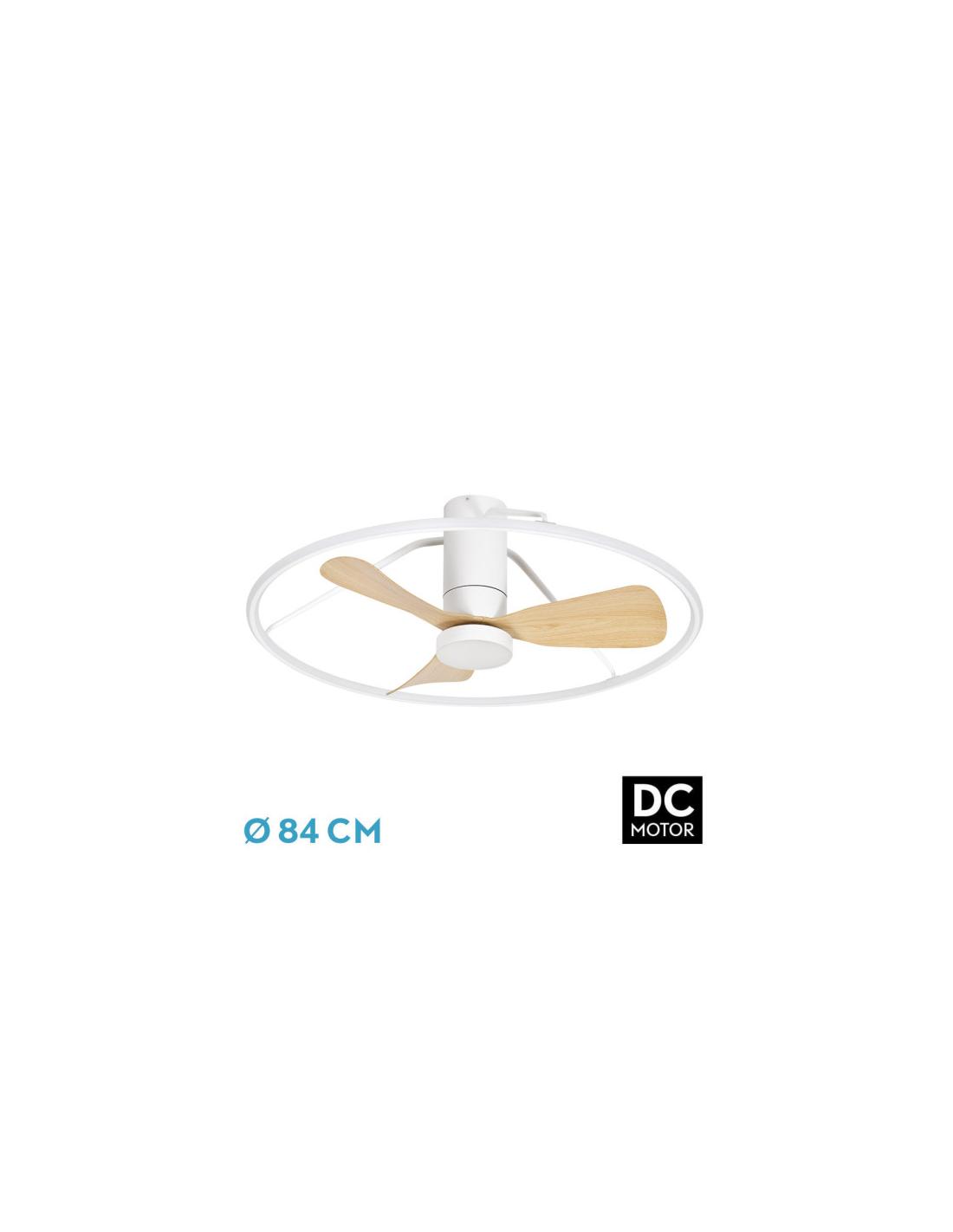 Fan DC from the OPORTO series made of ABS, silicone and metal, in WHITE color with three blades in HAYA color. It has six adjustable speeds with DC motor. Built-in LED technology with a power of 56W, 5600 lumens and 3 SELECTABLE LIGHT TEMPERATURES (3000-4000-6000K) warm, natural and cold white light. Fan very modern and futuristic design, its main body is surrounded by a ring of light combining very well with decoration styles both with modern styles as well as ethnic and natural. It has dimensions of 31.5x84x84 centimeters. Summer or winter air control. Remote control INCLUDED with LIGHT INTENSITY REGULATOR in three positions and TIMER that allows you to program so that the fan turns off automatically from 1 hour to 4 hours, which leads to great energy savings. You can use the VIA APP control: FAN LAMP PRO, from which you can also manage your fan easily and intuitively from your mobile. Model available in black/brown and white/beech and in two different sizes.
