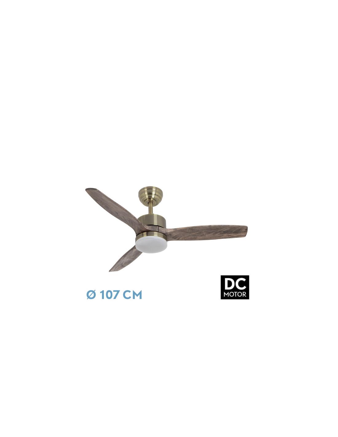 Fan DC TORINO series in LEATHER color with 3 blades in OAK color. Made of metal, wood and polycarbonate. It measures 35.3/47.8x107x107 centimeters. DC motor. Integrated LED technology with a power of 24W, 2424 lumens and SELECTABLE LIGHT COLOR IN 3 TEMPERATURES (3000-4000-6500K) warm, natural and cold white light. It has a remote control with 6 different speeds, color memory, summer/winter mode and 2/4/8 hour timer. Includes two 12.5 and 25 centimeter rods to install on ceilings at different heights. Model available in white and leather/oak.