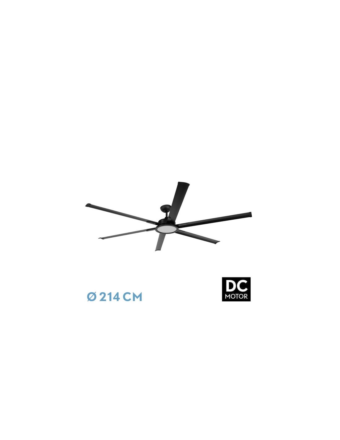 DCFan from the ALMANZOR series made of metal, aluminum and polycarbonate, in BLACK color with six blades. It has six adjustable speeds with DC motor. Built-in LED technology with a power of 24W, 2950 lumens and 3 SELECTABLE LIGHT TEMPERATURES (3000-4000-6000K) warm, natural and cold white light. Large Fan with aluminum blades, ideal for premises, offices, Living rooms and open rooms, with a very modern and elegant design, taking part in the decoration of your home or work. It has dimensions of 32/45x214x214 centimeters, includes two STEM sizes which allows it to be installed at different ceiling heights. Summer or winter air control. Remote control INCLUDED with LIGHT INTENSITY REGULATOR, BUILT-IN COLOR MEMORY and TIMER that allows programming so that the fan turns off automatically from 30 minutes to 2 hours, which leads to great energy savings.