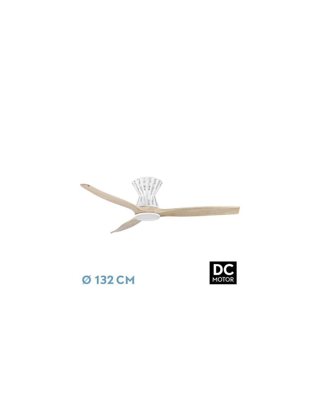 Fan DC from the BALTIR series made of metal, glass and wood, in WHITE color with three blades in HAYA color. It has six adjustable speeds with DC motor. Built-in LED technology with a power of 18W, 2250 lumens and 3 SELECTABLE LIGHT TEMPERATURES (3000-4000-6000K) warm, natural and cold white light. Fan large size for living rooms, bedrooms or open rooms, with a very modern and original design, Combining very well with ethnic and natural decoration styles. It has dimensions of 28x132x132 centimeters. Summer or winter air control. Remote control INCLUDED with LIGHT INTENSITY REGULATOR, BUILT-IN COLOR MEMORY and TIMER that allows programming so that the fan turns off automatically from 30 minutes to 2 hours, which leads to great energy savings. Model available in nickel/beech and white/beech.