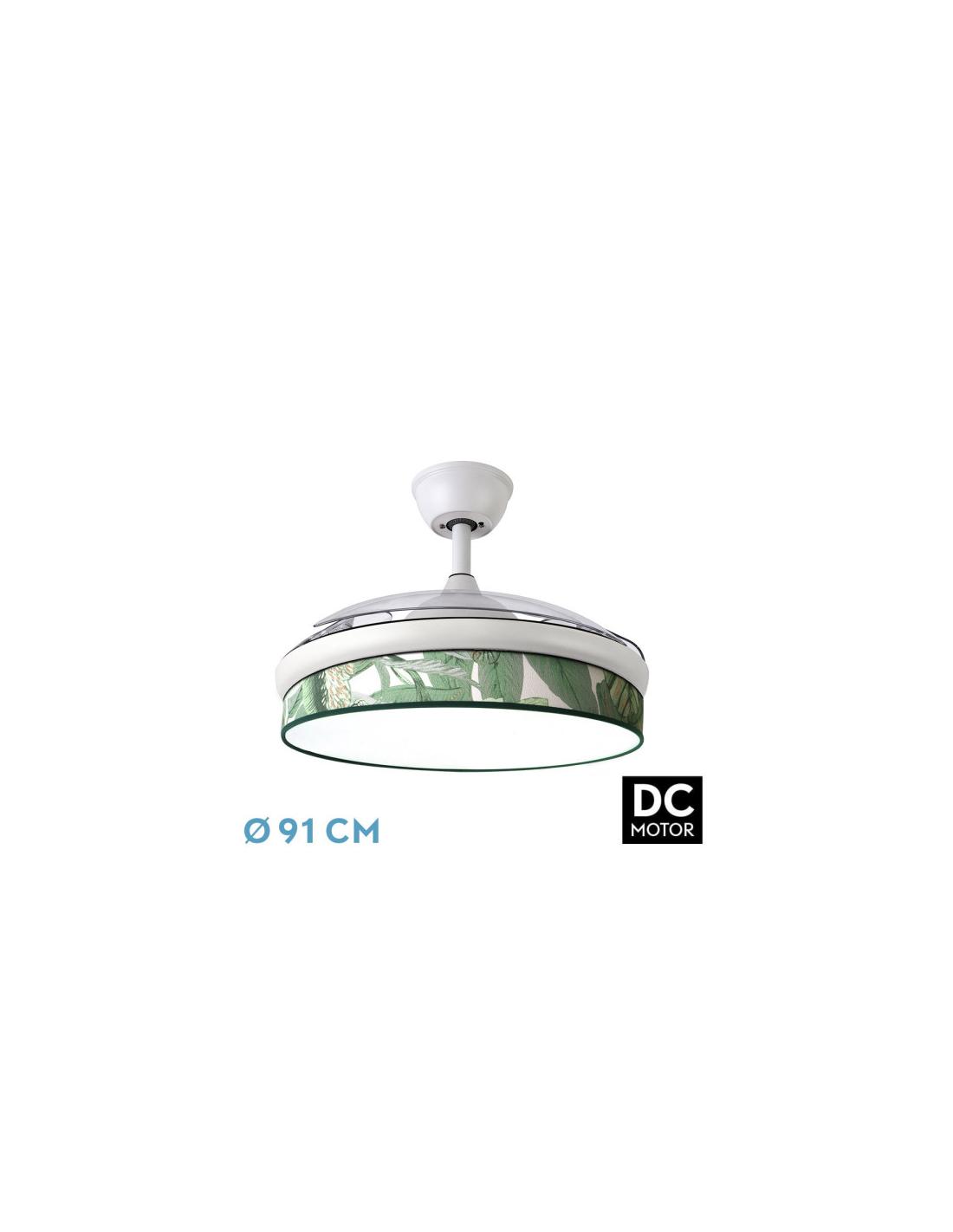 Exclusive and original DC fan from the MODA series with three FOLDABLE ABS blades, in WHITE color with GREEN LEAF diffuser. Made of metal, ABS, textile and polycarbonate. Modern and versatile style , the designs and colors of its diffusers make this fan both in operation and in lamp mode only, become the center of attention of the brightening room. Ideal for both modern and classic environments, very much in line with new decoration styles combining colors and textures. DC motor with six adjustable speeds. Integrated LED technology with a power of 72W, 7200 lumens and with 3 SELECTABLE LIGHT TEMPERATURES (3000-4000-6000K). Summer or winter air control. Its measurement is 37/52X40X40 centimeters with the blades folded and 37/52X91X91 centimeters with the blades unfolded, with two seatpost measurements to install it at different heights. Remote control INCLUDED with built-in COLOR MEMORY and 1/2/4 hour TIMER. Model available in both black and white, with a wide variety of designs and colors in its diffusers and in two sizes to choose from.