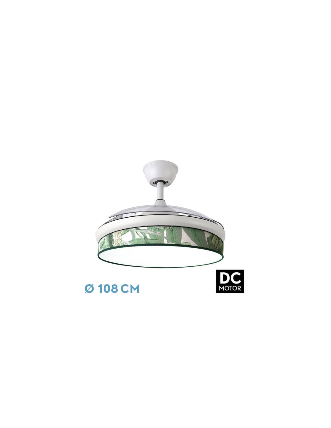 Exclusive and original DC fan from the MODA series with three FOLDABLE ABS blades, in WHITE color with GREEN LEAF diffuser. Made of metal, ABS, textile and polycarbonate. Modern and versatile style , the designs and colors of its diffusers make this fan both in operation and in lamp mode only, become the center of attention of the brightening room. Ideal for both modern and classic environments, very much in line with new decoration styles combining colors and textures. DC motor with six adjustable speeds. Integrated LED technology with a power of 72W, 7200 lumens and with 3 SELECTABLE LIGHT TEMPERATURES (3000-4000-6000K). Summer or winter air control. Its measurement is 39/54X49X49 centimeters with the blades folded and 39/54X108X108 centimeters with the blades unfolded, with two seatpost measurements to install it at different heights. Remote control INCLUDED with built-in COLOR MEMORY and 1/2/4 hour TIMER. Model available in both black and white and with a wide variety of designs and colors in its diffusers.